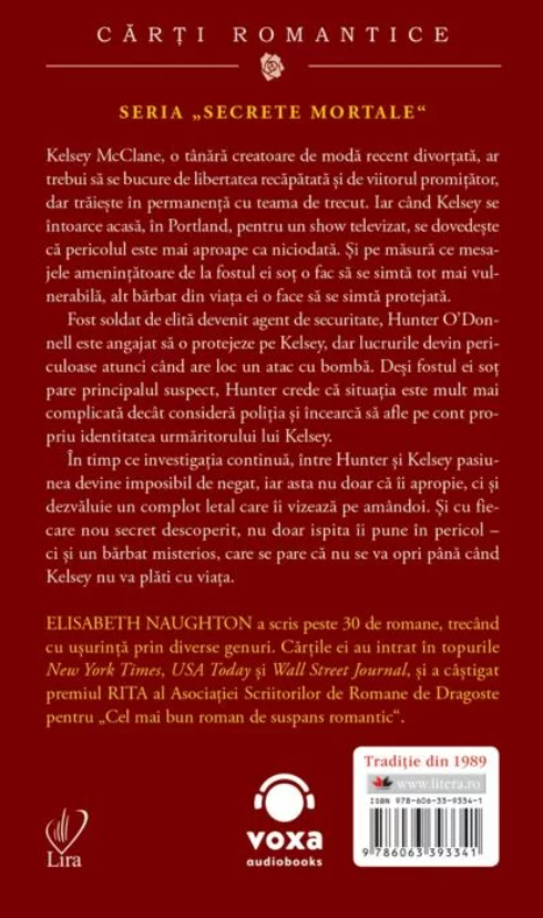 ELISABETH NAUGHTON a scris peste 30 de romane, trecând cu ușurință prin diverse genuri. Cărțile ei au intrat în topurile New York Times, USA Today și Wall Street Journal, și a câștigat premiul RITA al Asociației Scriitorilor de Romane de Dragoste pentru „Cel mai bun roman de suspans romantic“.