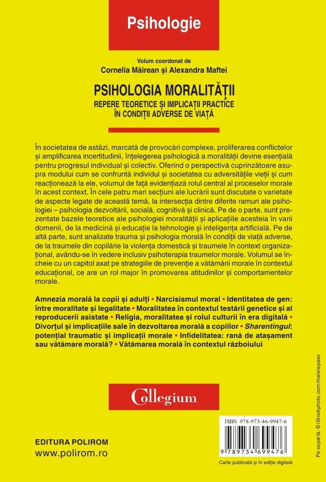 În societatea de astăzi, marcată de provocări complexe, proliferarea conflictelor și amplificarea incertitudinii, înțelegerea psihologică a moralității devine esențială pentru progresul individual și colectiv. Oferind o perspectivă cuprinzătoare asupra modului cum se confruntă individul și societatea cu adversitățile vieții și cum reacționează la ele, volumul de față evidențiază rolul central al proceselor morale în acest context.