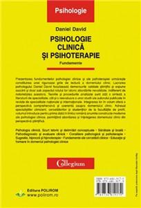 Prezentarea fundamentelor psihologiei clinice si ale psihoterapiei urmareste constituirea unei riguroase grile de lectura a domeniului clinic. Lucrarea psihologului Daniel David expune succint, sub aspectul rolului lor istoric, abordarile nevalidate, indiferent de notorietatea acestora. Teoriile si procedurile analizate sint atit o sinteza a literaturii de specialitate, cit si o reevaluare a unor studii ale autorului publicate in reviste de specialitate nationale si internationale. Integrarea lor in volum ofera o perspectiva comprehensiva si coerenta asupra domeniului clinic. Adresat specialistilor clinicieni, cercetatorilor si studentilor de la facultatile de profil, volumul introduce pentru prima data in limba romana anumite constructe moderne ale psihologiei clinice, permitind abordarea si intelegerea domeniului clinic din perspectiva stiintifica.
