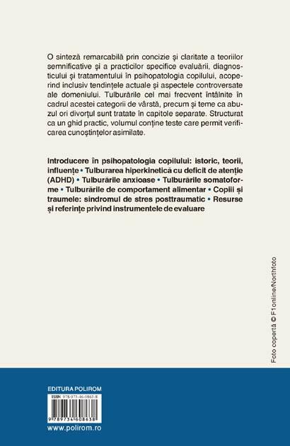 Lucrarea ofera o sinteza remarcabila prin concizie si claritate a teoriilor semnificative si a practicilor specifice evaluarii, diagnosticului si tratamentului in psihopatologia copilului, acoperind inclusiv tendintele actuale si aspectele disputate ale domeniului. Tulburarile cel mai frecvent intilnite in cadrul acestui grup de virsta, precum si teme ca abuzul ori divortul sint tratate in capitole separate. Structurat ca un ghid practic, volumul contine teste care permit verificarea cunostintelor asimilate.