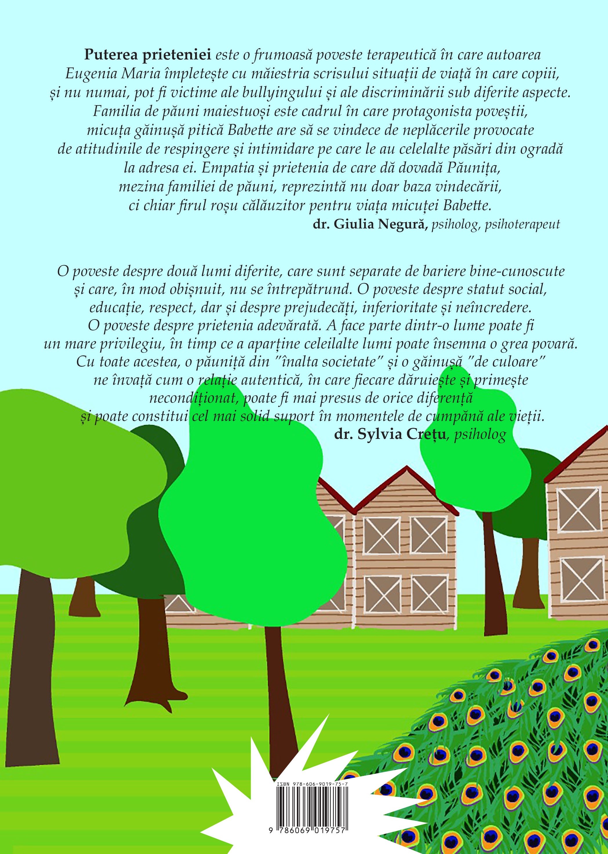 Puterea prieteniei este o frumoasă poveste terapeutică în care autoarea Eugenia Maria împletește cu măiestria scrisului situații de viață în care copiii, și nu numai, pot fi victime ale bullyingului și ale discriminării sub diferite aspecte. Familia de păuni maiestuoși este cadrul în care protagonista poveștii, micuța găinușă pitică Babette are să se vindece de neplăcerile provocate de atitudinile de respingere și intimidare pe care le au celelalte păsări din ogradă la adresa ei. Empatia și prietenia de care dă dovadă Păunița,mezina familiei de păuni, reprezintă nu doar baza vindecării, ci chiar firul roșu călăuzitor pentru viața micuței Babette. - dr. Giulia Negură, psiholog, psihoterapeut