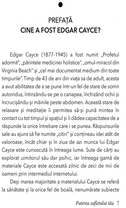 Edgar Cayce (1877-1945) s-a nascut la o ferma de langa Hopkinsville, Kentukcy. In general, a fost un individ mediocru. Totusi, de-a lungul vietii sale, a manifestat unul dintre cele mai remarcabile talente mediumnice din toate timpurile. De tanar, el a remarcat ca era capabil sa intre in stari de transa auto-indusa, care ii dadeau posibilitatea sa se conecteze la o sursa nelimitata de informatie. In timp ce era in transa, putea sa raspunda la intrebari sau sa dea discursuri amanuntite pe orice tema. Aceste discursuri, mai mult de 14.000 la numar, au fost transcrise in timp ce el vorbea, si sunt denumite „citiri”.