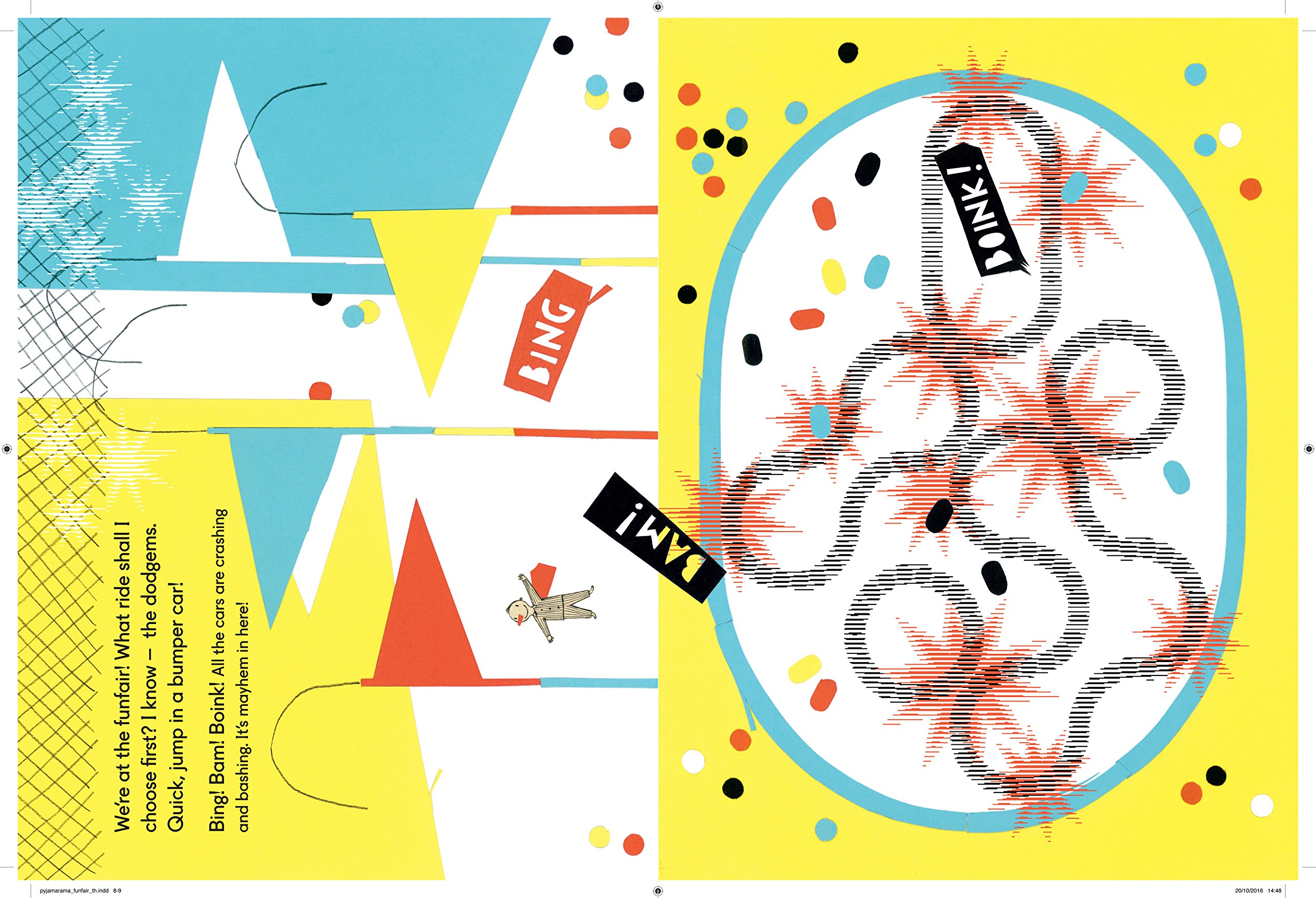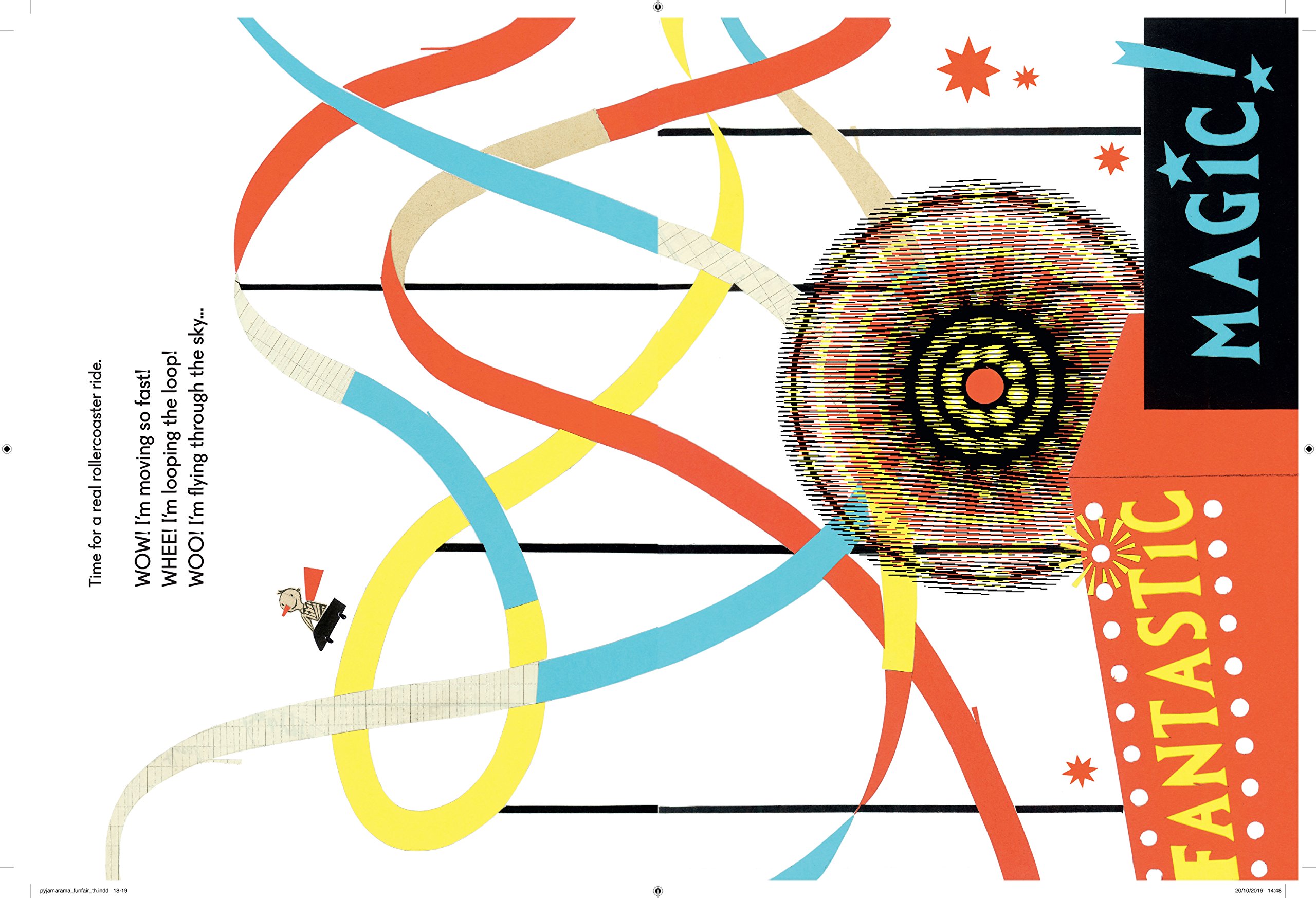 When you see the world in Pyjamavision, everything looks extraordinary! Move the stripy screen over each page and watch the colours and shapes come to life. When a little boy puts on his pyjamas and goes to bed, he falls into a fantastical fairground full of glittering lights, sparkling stalls and rip-roaring rides. Come with him for a noisy night of eye-popping fun and games...