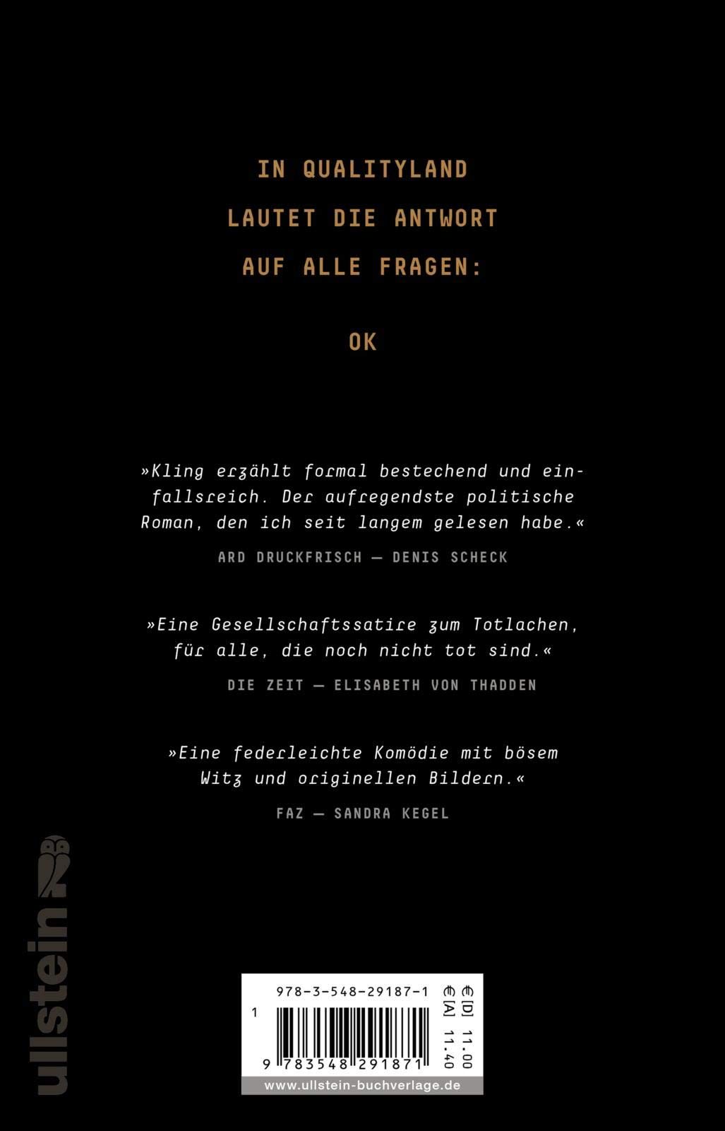 Willkommen in QualityLand, in einer nicht allzu fernen Zukunft: Alles läuft rund - Arbeit, Freizeit und Beziehungen sind von Algorithmen optimiert. Trotzdem beschleicht den Maschinenverschrotter Peter Arbeitsloser immer mehr das Gefühl, dass mit seinem Leben etwas nicht stimmt. Wenn das System wirklich so perfekt ist, warum gibt es dann Drohnen, die an Flugangst leiden, oder Kampfroboter mit posttraumatischer Belastungsstörung? Warum werden die Maschinen immer menschlicher, aber die Menschen immer maschineller? Marc-Uwe Kling hat die Verheißungen und das Unbehagen der digitalen Gegenwart zu einer verblüffenden Zukunftssatire verdichtet, die lange nachwirkt. Visionär, hintergründig – und so komisch wie die Känguru-Trilogie.