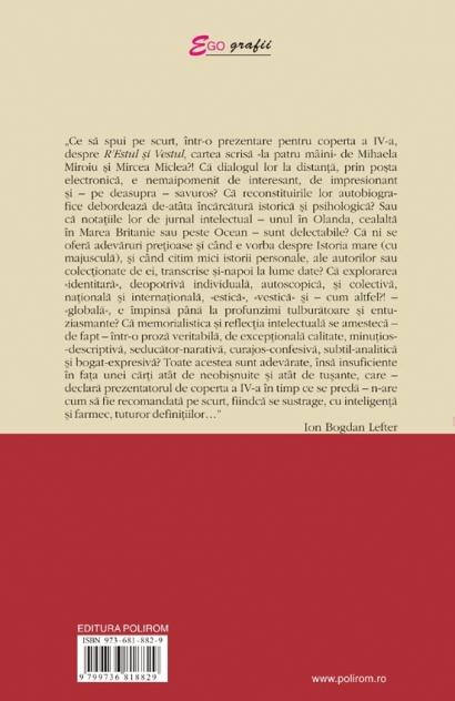 Volumul reuneste notatiile de jurnal ale celor doi autori – Mircea Miclea aflat in Olanda, iar Mihaela Miroiu, in Marea Britanie, apoi peste Ocean. Un dialog purtat la distanta, prin posta electronica, in care reflectia asupra identitatii, deopotriva individuala si colectiva, nationala si internationala, „estica” si „vestica” este impinsa pina la profunzimi tulburatoare.