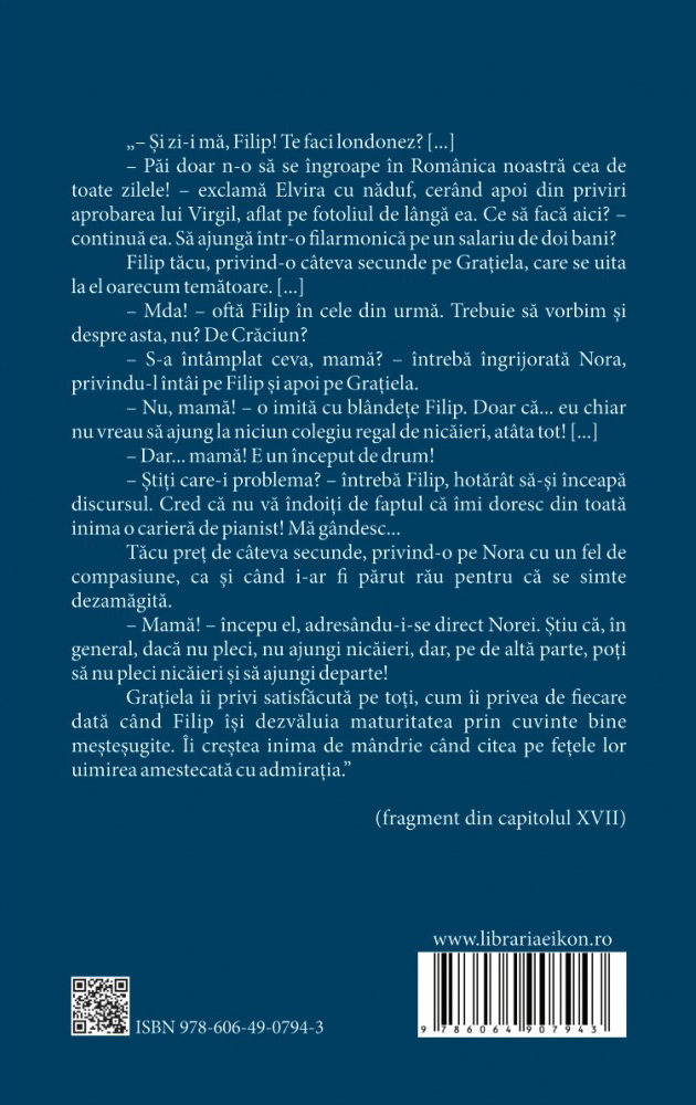 „A fost nevoită să renunțe la șederea la părinți, revenind în grabă acasă, în speranța că lucrurile se vor îndrepta. Din păcate însă, starea ei se agrava pe zi ce trecea. Din cauza coșmarurilor persistente a început să aibă insomnii chinuitoare. De cele mai multe ori, deși lua regulat melatonină, nopțile și le petrecea în bucătărie, în timp ce Călin, în cele din urmă, cădea răpus de oboseala zilelor lungi petre-cute la Snagov, unde lucra fizic alături de muncitorii angajați pentru toate amenajările și schimbările care s-au decis și care trebuiau rezolvate până în septembrie, când întreaga familie dorea deschiderea școlii. Apoi, spre dimineață, când simțea că nu mai rezistă, se băga și ea în pat alături de el, dar, în mod cu totul și cu totul straniu și de neînțeles, de îndată ce îi vedea chipul, o apuca o spaimă incontrolabilă, care culmina cu atacuri de panică extrem de intense. Simțea că nu mai poate inspira nici măcar o gură de aer, se chinuia, apăsându-se pe piept, cu gura deschisă, inima începea să îi bată nebunește și simțea că pur și simplu este pe cale să moară sufocată. Fugea la baie, disperată, și se stropea cu apă rece pe față, pe gât, pe piept, udându-se toată, reușind în cele din urmă să inspire, cu un horcăit îngrozitor. Apoi, când, încetul cu încetul, începea să respire cât de cât mai normal, așa udă cum era, se târa până în bucătărie, se așeza pe un scaun și stătea privind în gol până se lumina de ziuă.” (fragment)