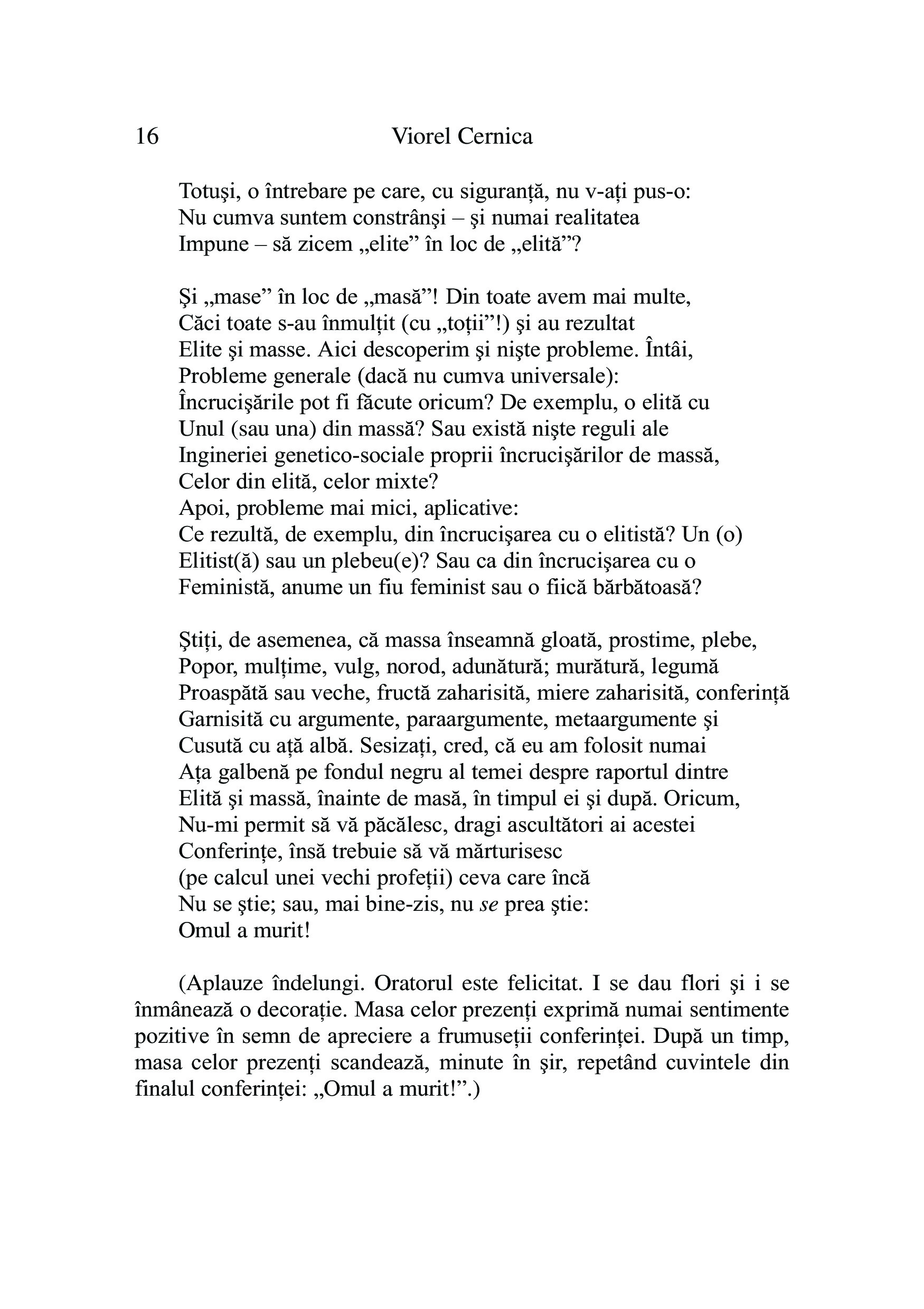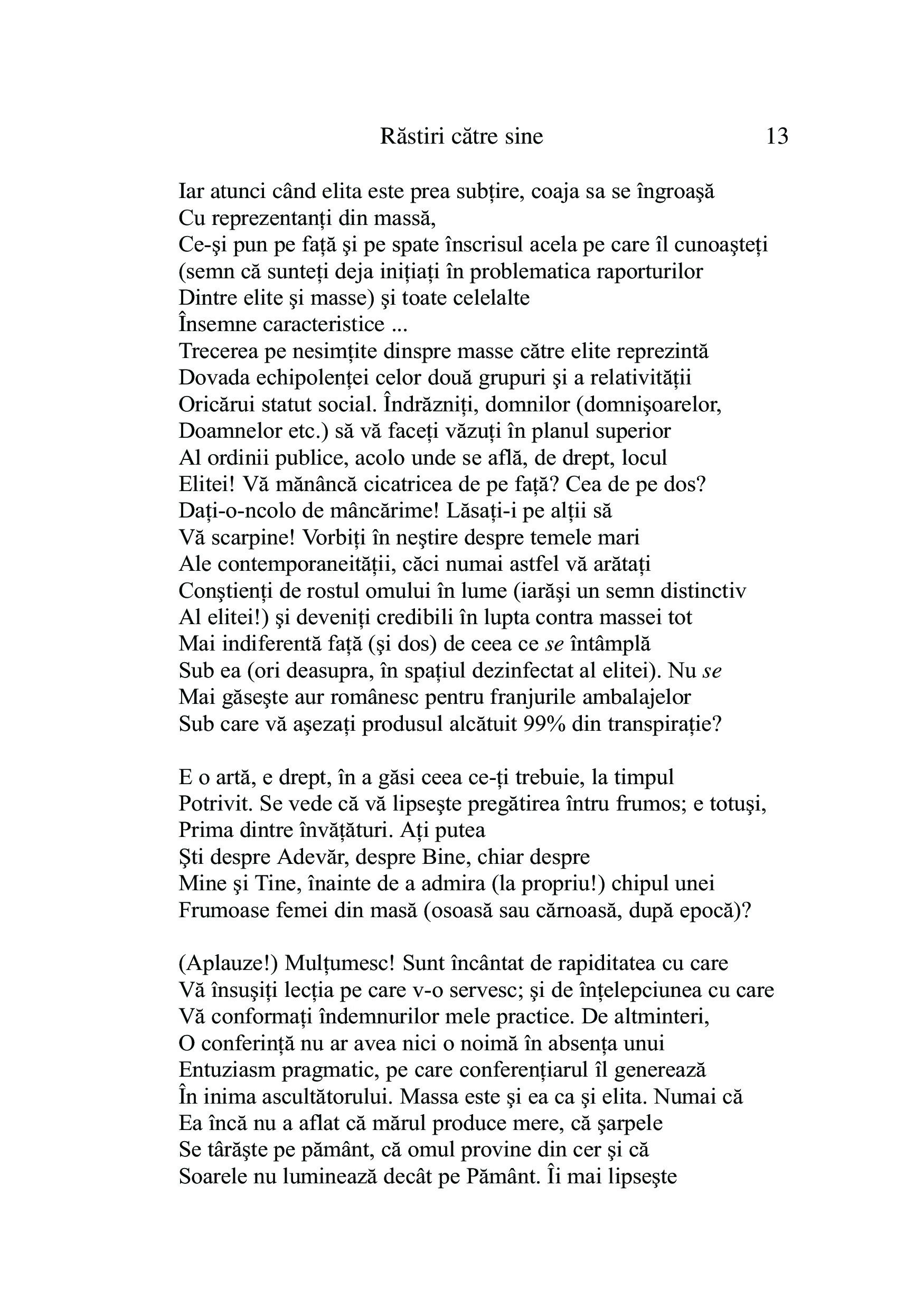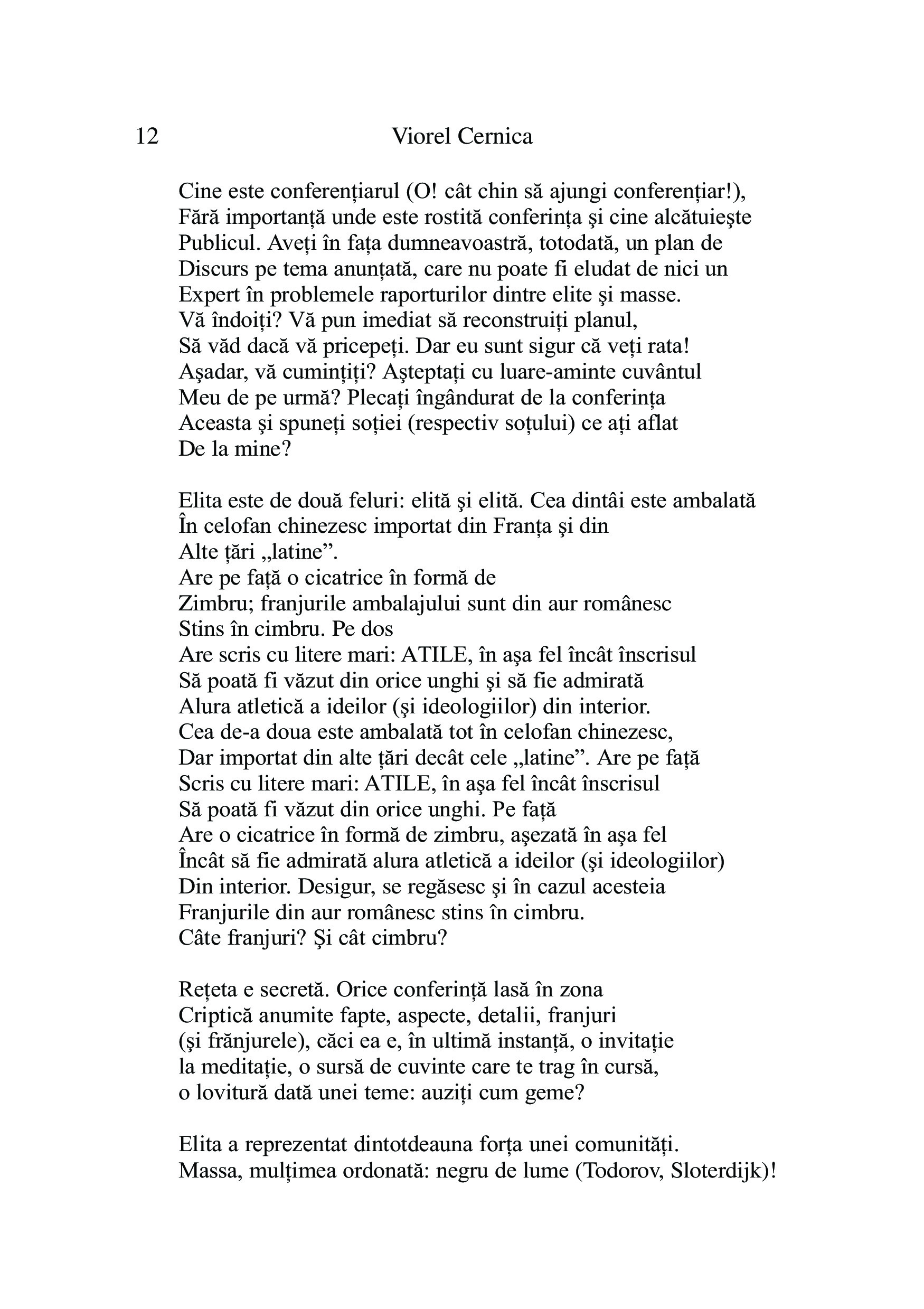 O fenomenologie a individualului (sinele) care, cu vorbele lui Noica, simte că nu poate fi ceva în absenţa generalului (legea), ţintind către prinderea acestuia, vă propune lucrarea de faţă. Adică o ideologie polifonică aplicată unor situaţii publice atotcunoscute; de atotştiutori, adică de cei care, nepierzând nimic din ceea ce le oferă, spre ştiinţă comună, mediul public, pierd din vedere fenomenul şi, odată cu acesta, absurdul, tragicul, şi sublimul din orizontul vieţuirii omeneşti, cu toate că nu le sunt străine conferinţele, disertaţiile, cuvântările semenilor (lor) despre propriul sine şi despre legea comună.