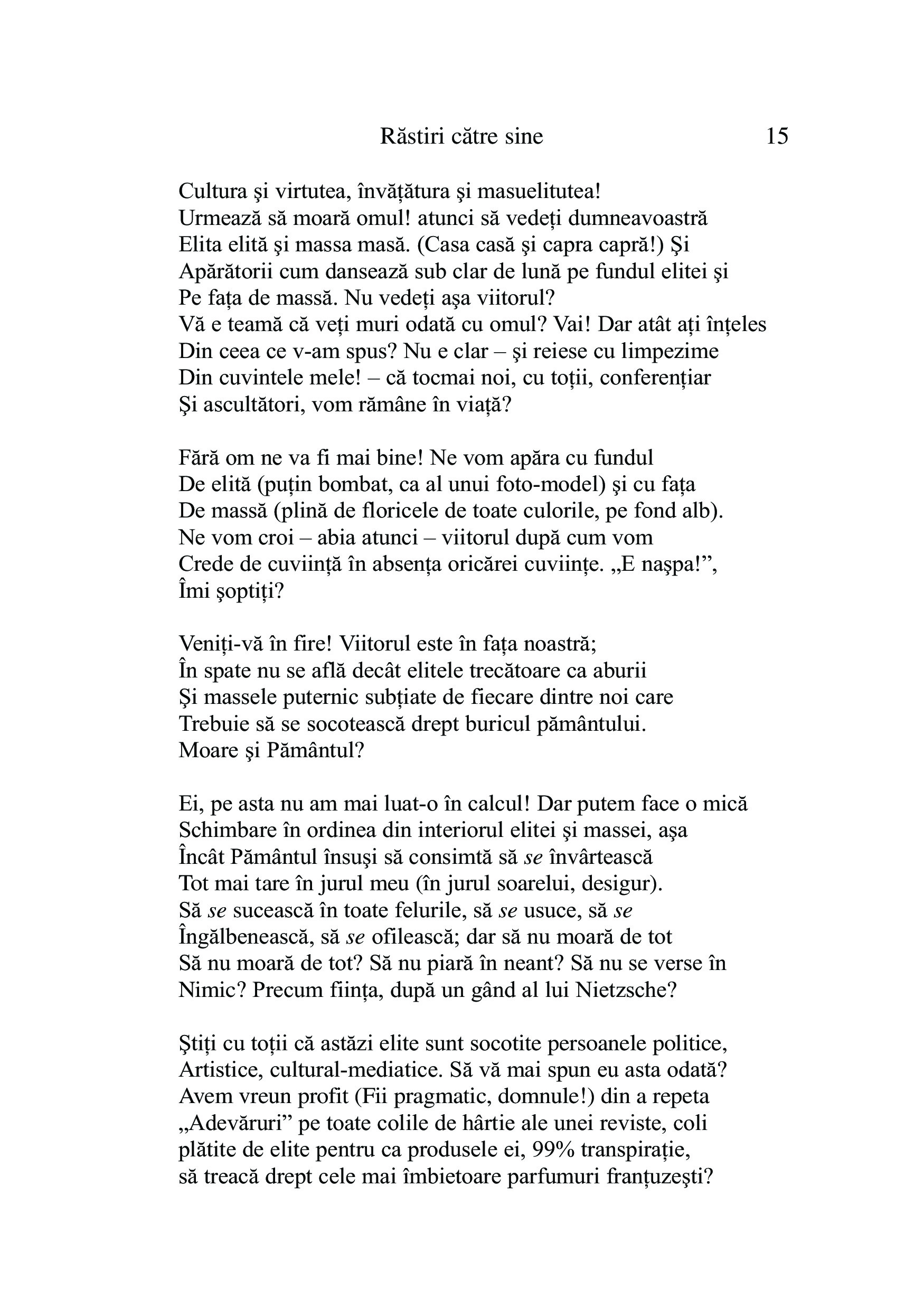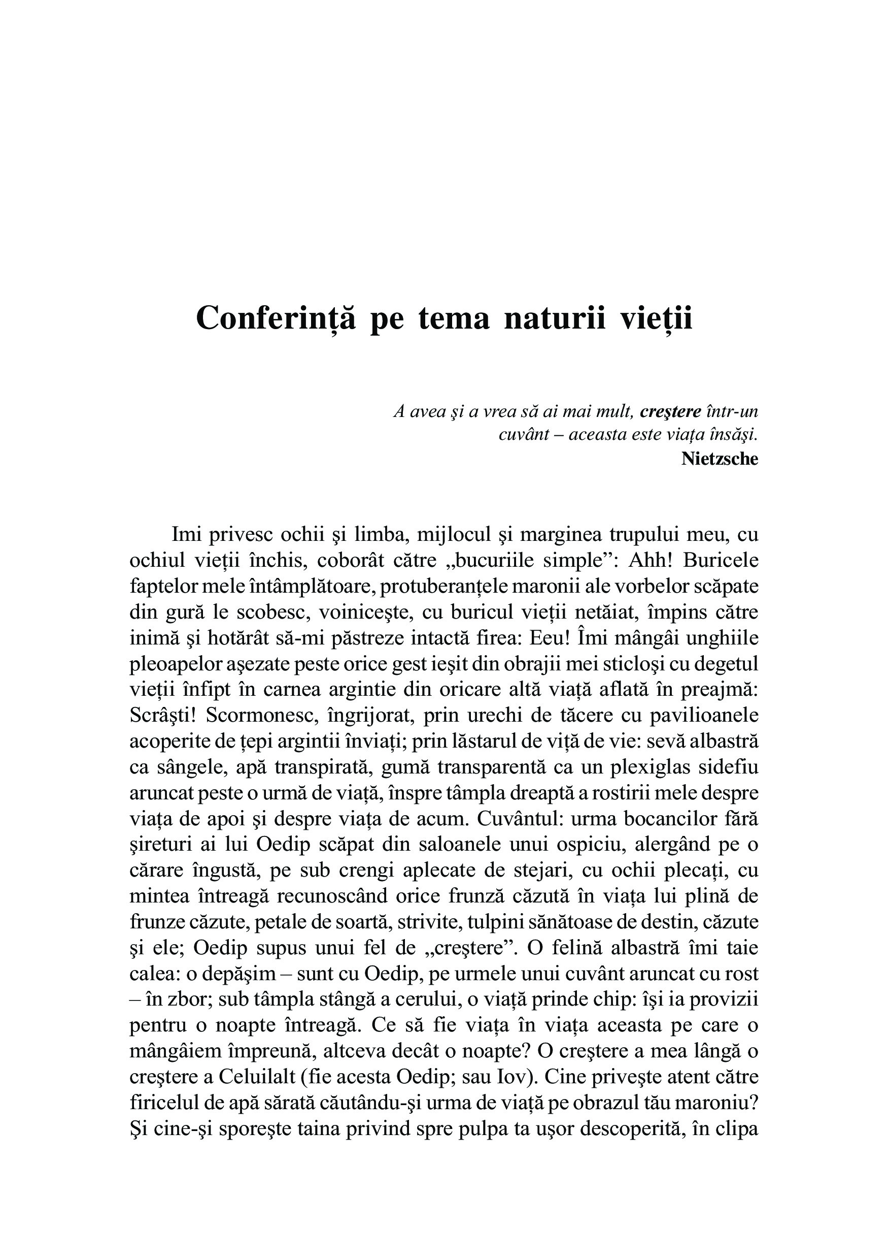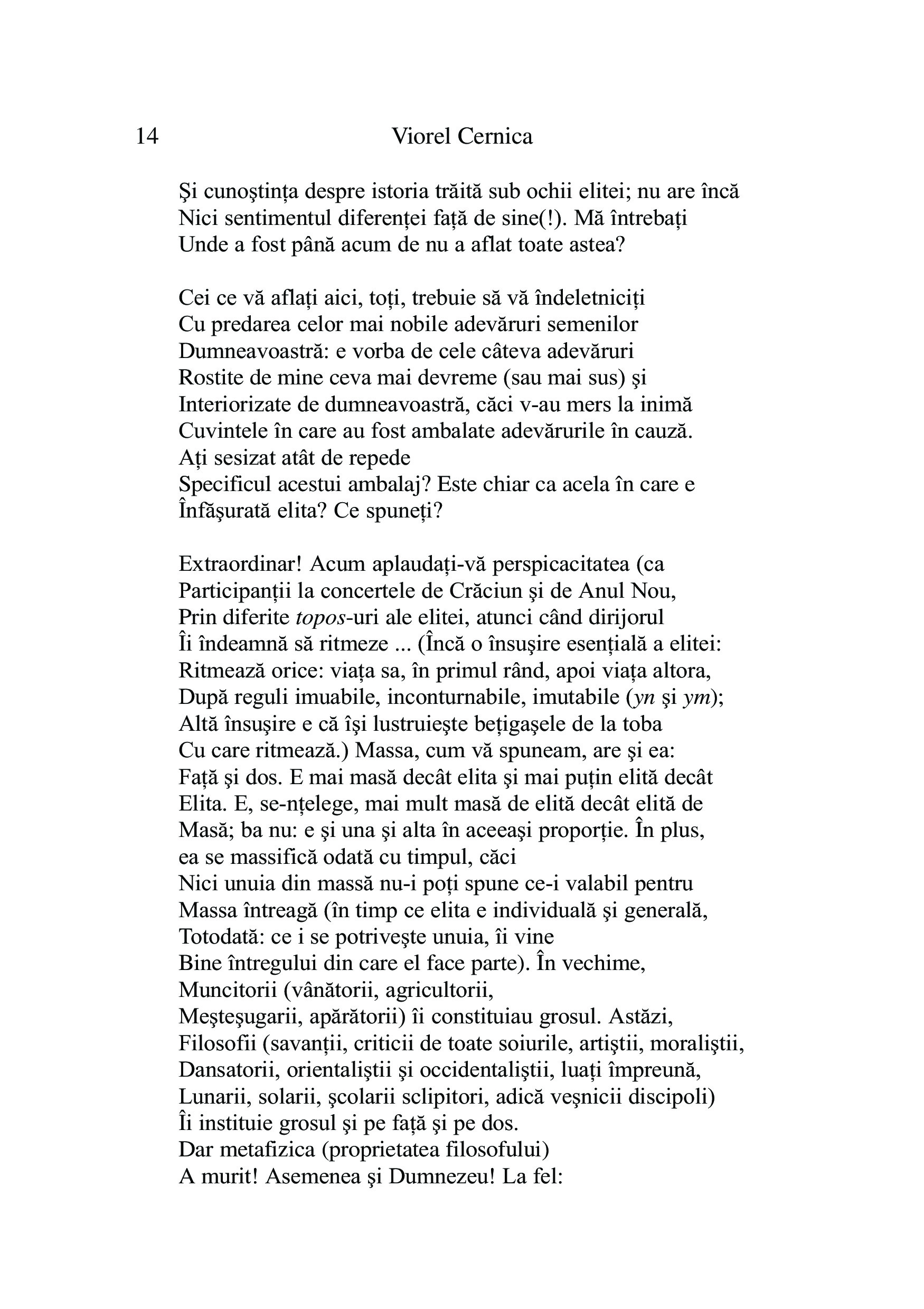 O fenomenologie a individualului (sinele) care, cu vorbele lui Noica, simte că nu poate fi ceva în absenţa generalului (legea), ţintind către prinderea acestuia, vă propune lucrarea de faţă. Adică o ideologie polifonică aplicată unor situaţii publice atotcunoscute; de atotştiutori, adică de cei care, nepierzând nimic din ceea ce le oferă, spre ştiinţă comună, mediul public, pierd din vedere fenomenul şi, odată cu acesta, absurdul, tragicul, şi sublimul din orizontul vieţuirii omeneşti, cu toate că nu le sunt străine conferinţele, disertaţiile, cuvântările semenilor (lor) despre propriul sine şi despre legea comună.