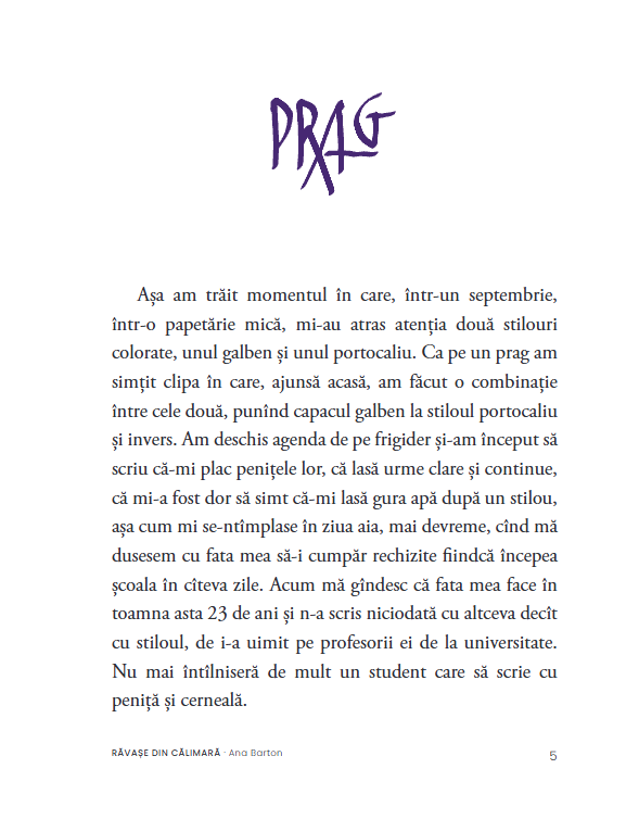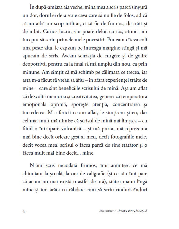 Curios lucru, sau poate deloc curios, atunci am inceput sa scriu primele mele povestiri. Puneam citeva coli una peste alta, le capsam pe intreaga margine stinga si ma apucam de scris. Aveam senzatia de curgere si de golire deopotriva, pentru ca la final sa ma umplu din