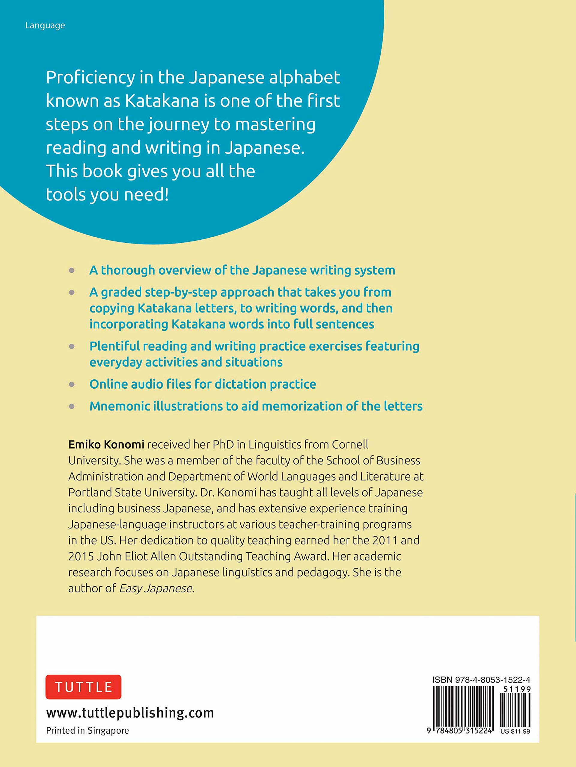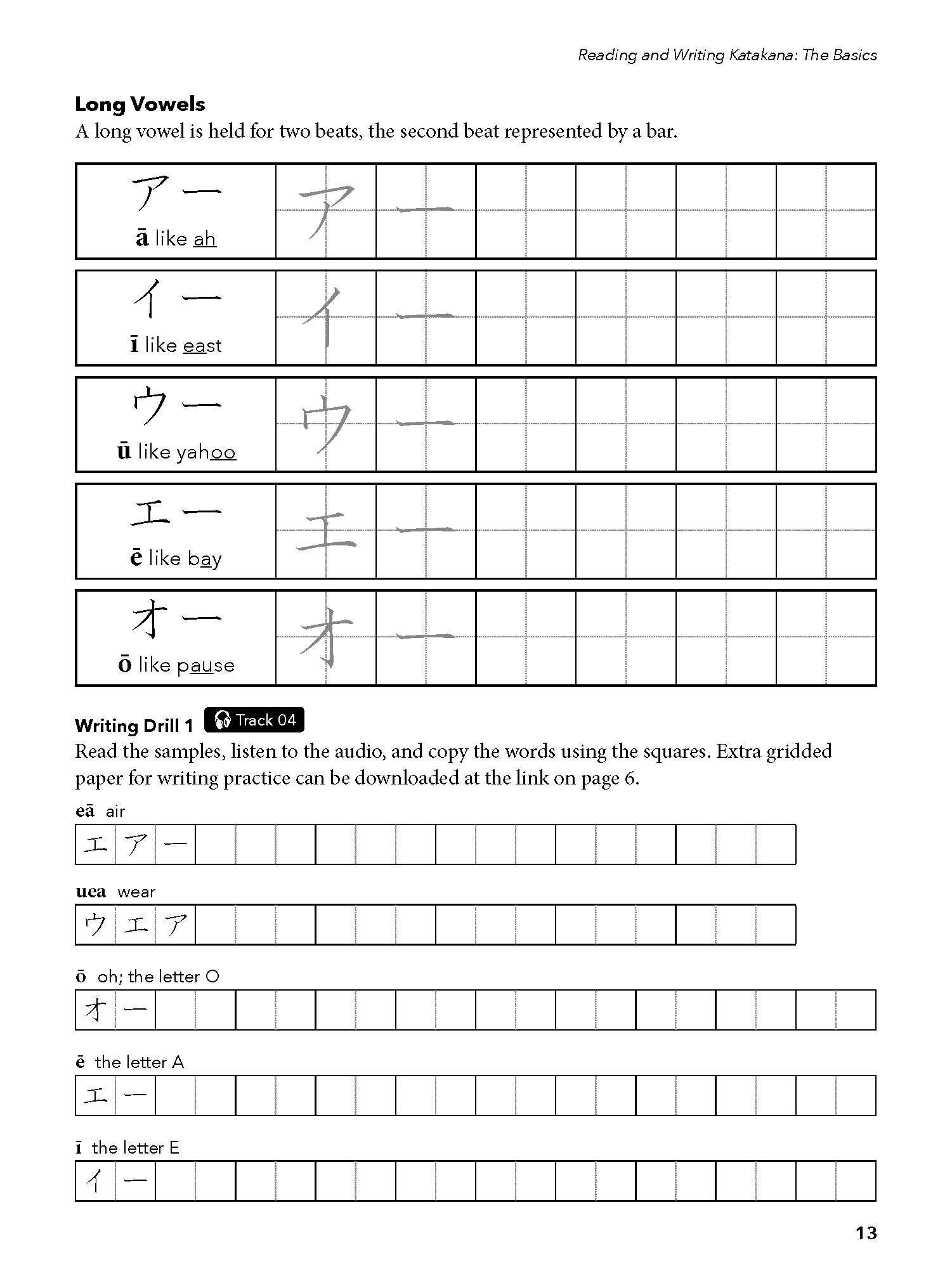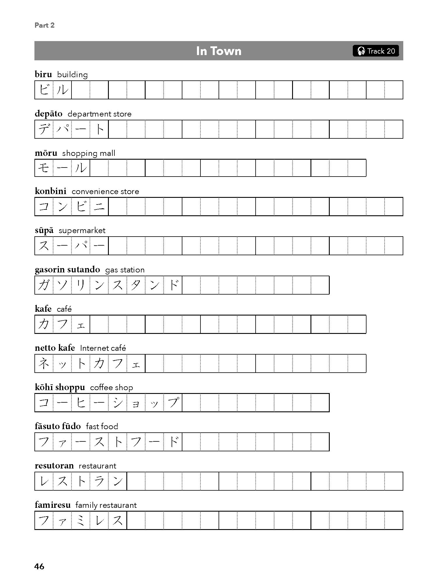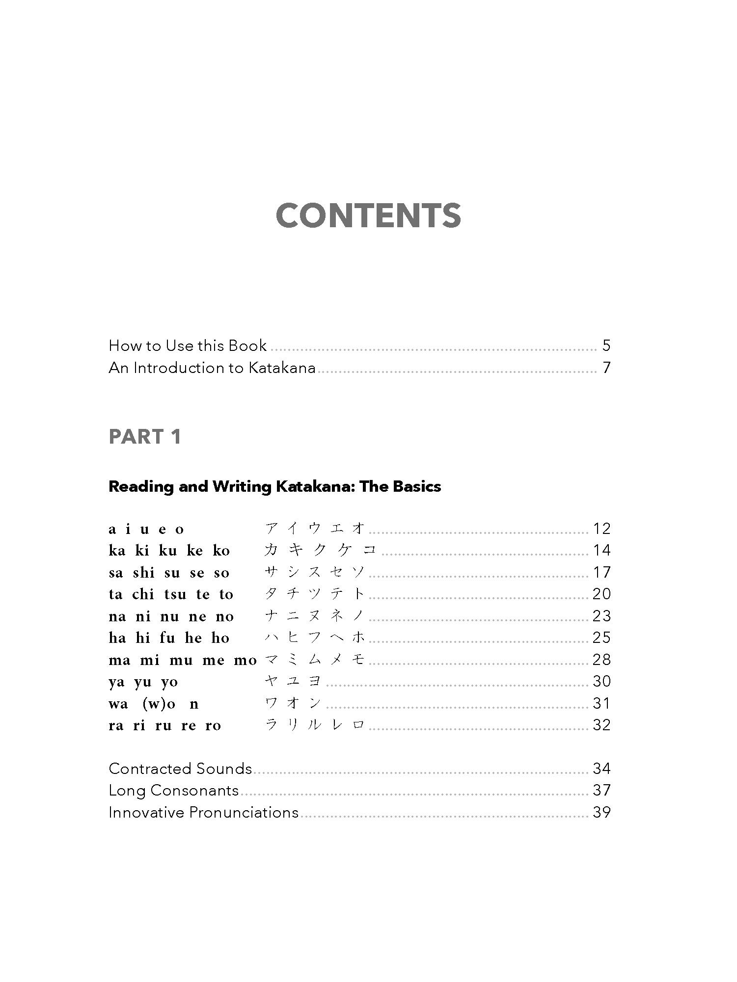 With plentiful writing and reading practice, this workbook starts with the basic letters and works up to writing words and complete sentences. Divided into two parts, the first part presents the 46 main Katakana letters in their full and contracted forms, with extensive writing spaces provided for writing practice. Recognition and pronunciation of the letters are reinforced through writing and listening exercises.