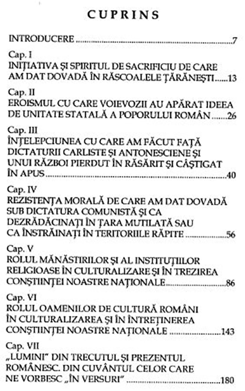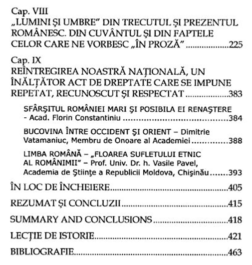 Lucrarea cuprinde o pledoarie pentru susţinerea ideii de reîntregire teritorială a României. În acest scop, pe lângă textele proprii, autorul a apelat la trei invitaţi de onoare, cum îi numeşte - acad. Florin Constantiniu, Dimitrie Vatamaniuc şi prof. univ. dr. Vasile Pavel. Autorul se referă şi la drepturile pe care le au românii asupra teritoriilor româneşti din Nord-Est şi din Est, care, după 1940 şi 1944, au rămas în afara graniţelor noastre generice. Foarte multe dintre ideile autorului şi ale invitaţilor lui sunt ilustrate cu o bogăţie de reproduceri din ziare diverse, hărţi, fotografii, statistici, tabele cu nume.