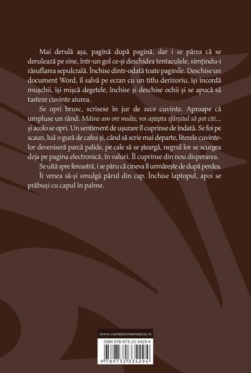 Se foi pe scaun, luă o gură de cafea și, când să scrie mai departe, literele cuvintelor deveniseră parcă palide, pe cale să se șteargă, negrul lor se scurgea deja pe pagina electronică, în valuri. Îl cuprinse din nou disperarea.