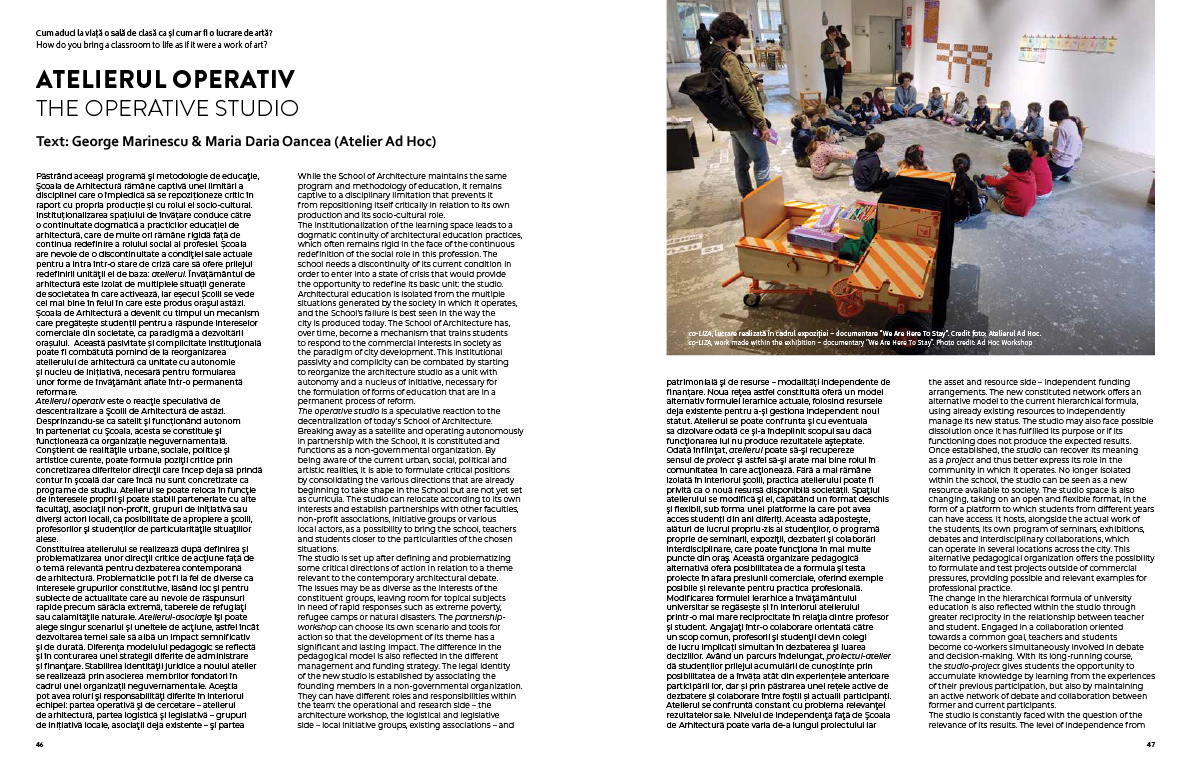 Acest dosar Arta dedicat educației, apare datorită invitației adresate de Marina Oprea, alături de Gabriela Mateescu, și cuprinde majoritatea dilemelor cu care ne-am confruntat pe tot parcursul nostru de artiști pedagogi: de la necesitatea unor certitudini care să dea sens eforturilor noastre, la nevoia raportării la niște cadre teoretice actuale; de la cunoașterea contextului istoric, la înțelegerea celui contemporan; de la idea de spații educaționale la idea de spații de învățare sigure și incluzive; de la blocajul în narativa de ateliere „alternative” și „non-formale”, la programul de lungă durată; de la frica față de o educație suspendată între „edutainement” și „pedagogical aesthetics”, la speranța că arta încă are capacitatea de a inventa „coordonate mutante” și de a genera „calități ale ființei fără precedent”