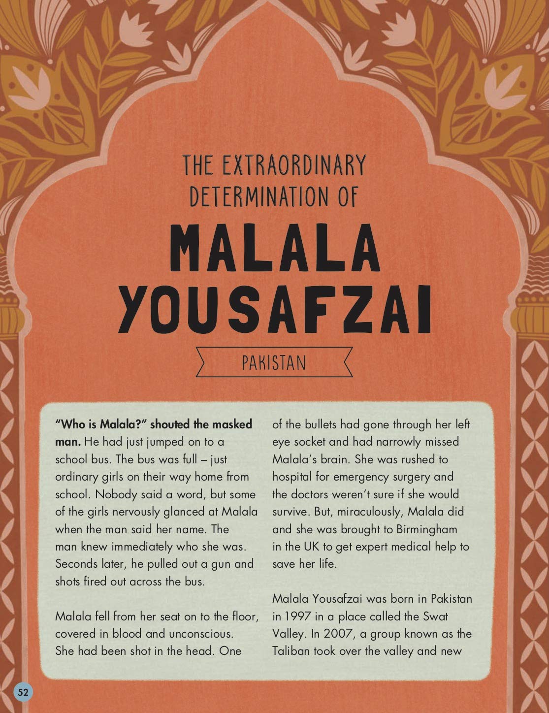 It features over 29 tales of amazing young girls and boys who have achieved the unimaginable from surviving a plane crash in the jungle to striking against climate change. There are tales of triumphing over illness and injury, and of overcoming bullying. Entries include Greta Thunberg, Boyan Slat and Phiona Mutesi, to name a few.