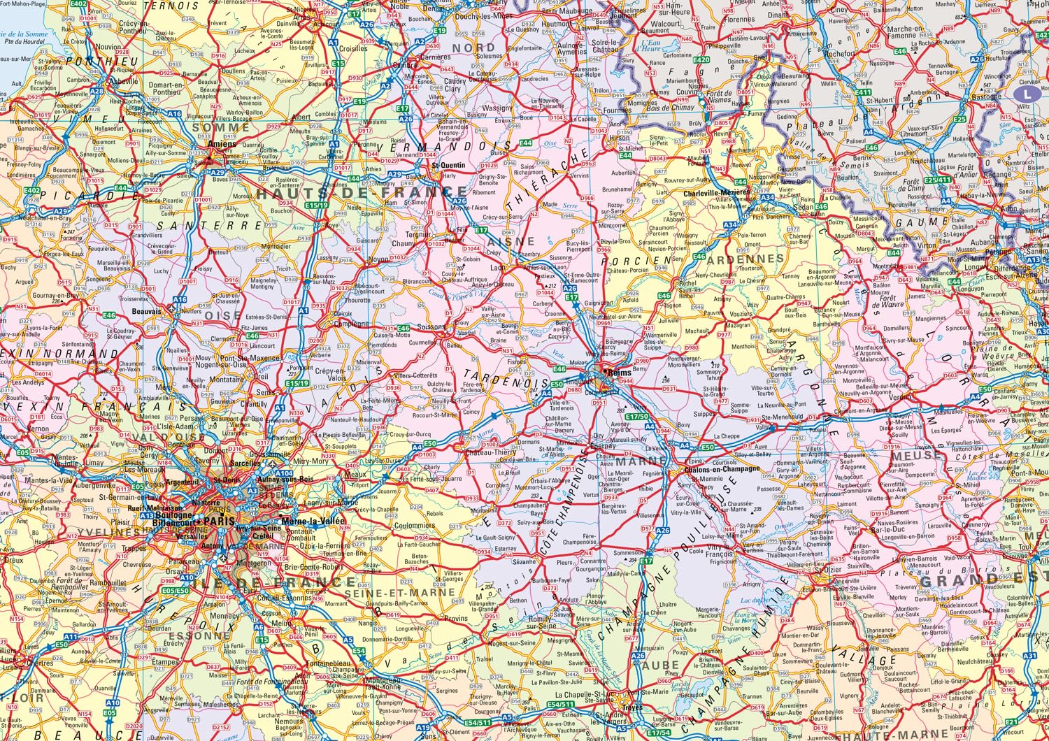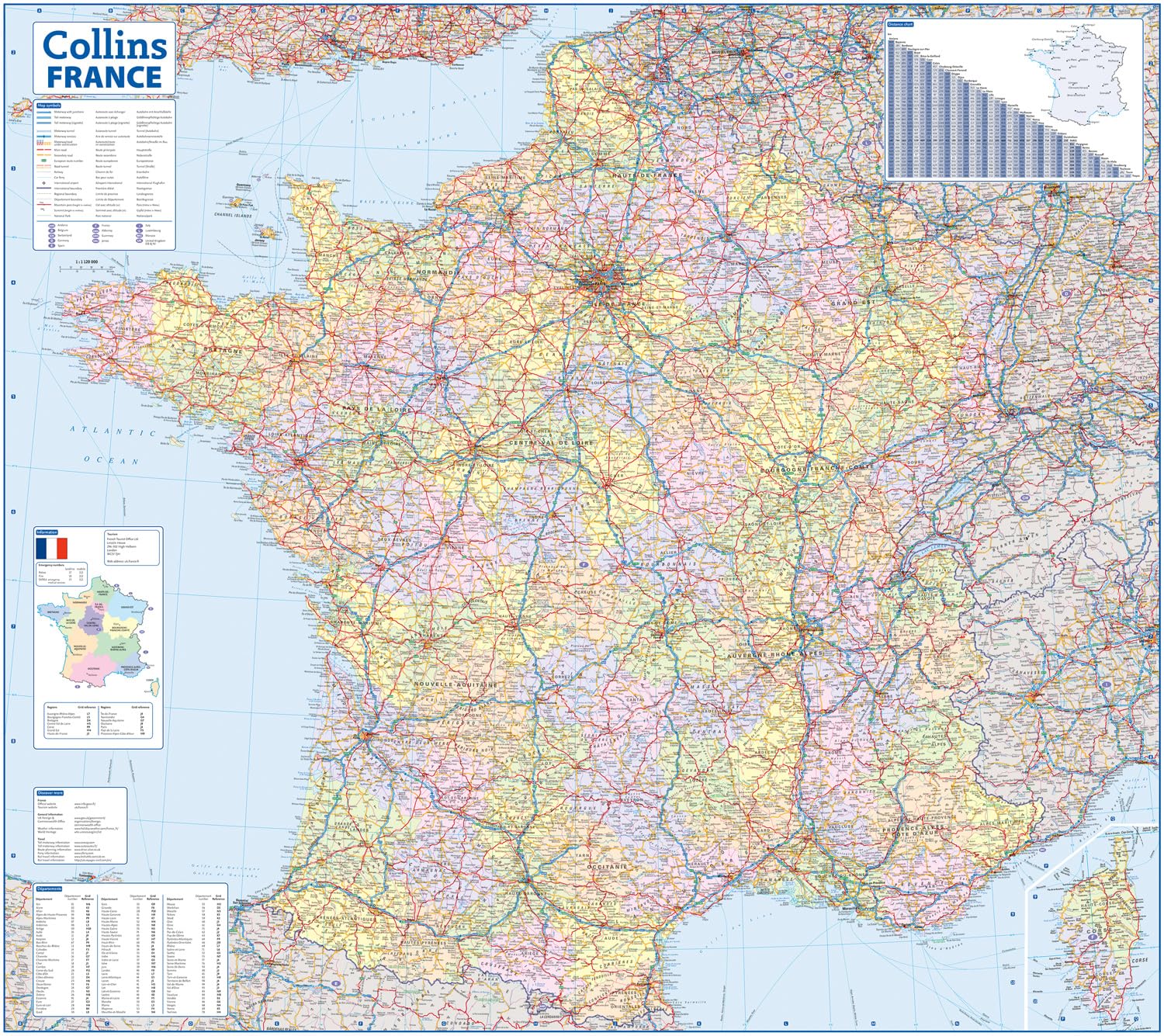 The map shows the road network in detail for easy route planning. With its political colouring of departments, it is ideal for reference and business users also.