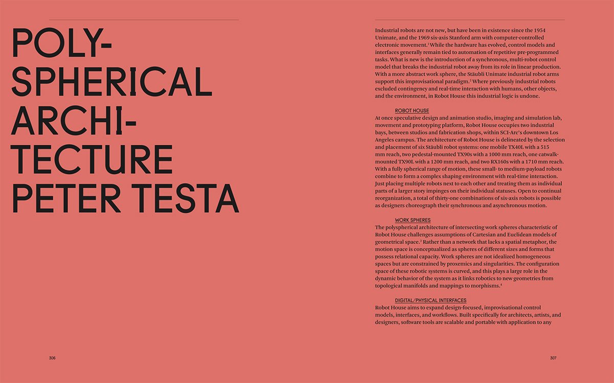 The next generation of architectural design is moving outside the box. Robotic arms are beginning to replace and advance now common digital fabrication technologies. Six-axis robots are showing the way to non-linear workflows, interactive interfaces, tools, and material technologies that can radically alter the established process of how we design and build space, offering a new paradigm for architecture. This book has three central sections: ‘Techniques’, which sets out the fields and the thinking that underlie the new uses for robotics; 'Projects', offering detailed presentations that explore through prototypes and working models how these principles can be applied and augmented.
