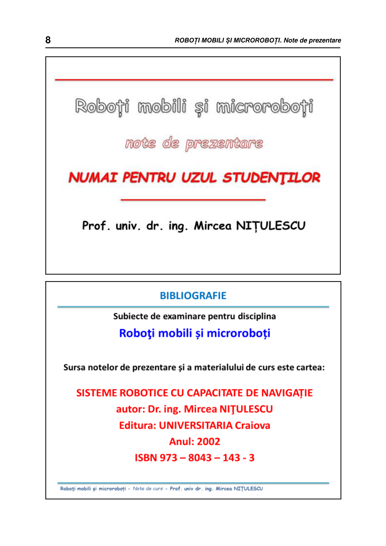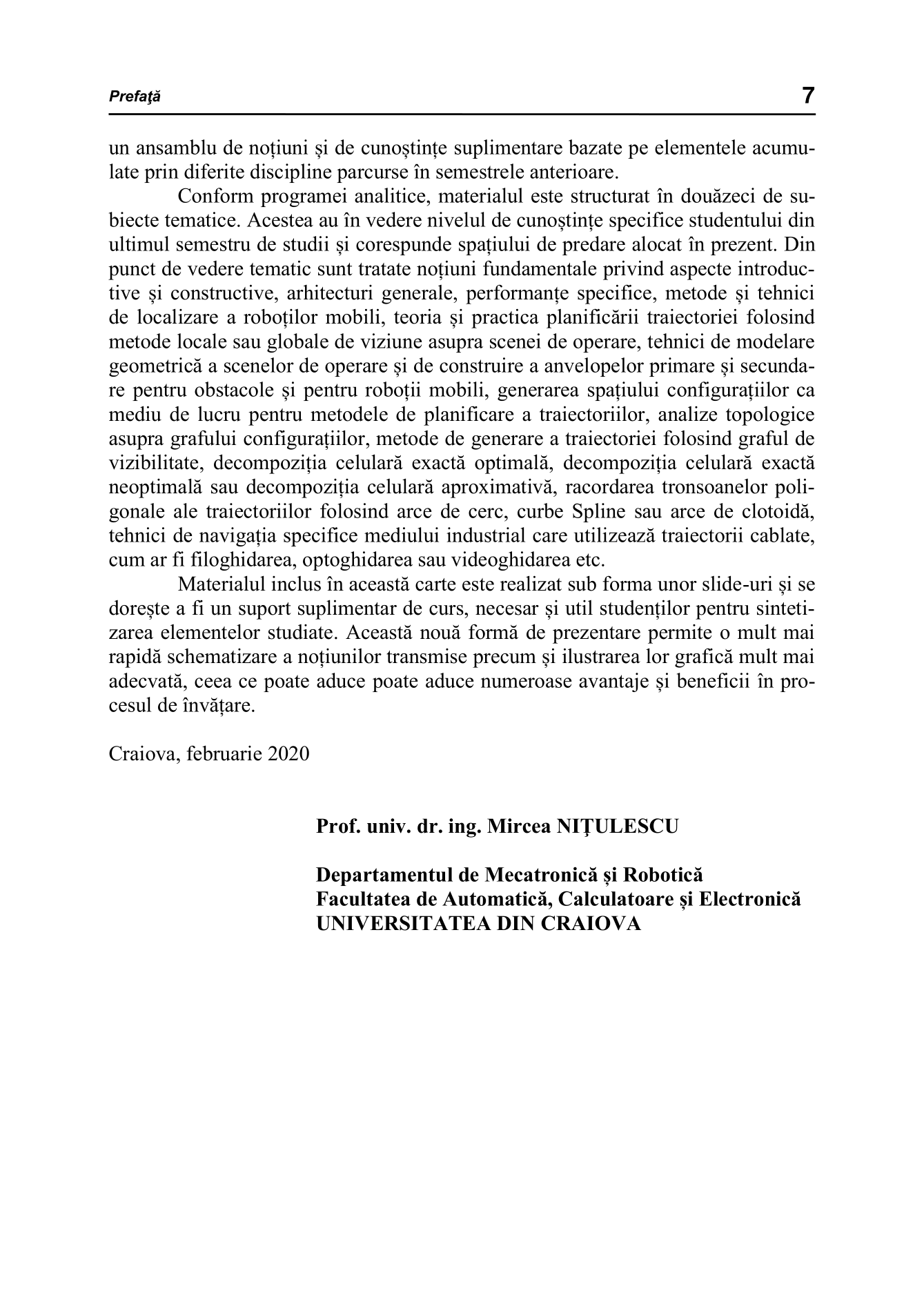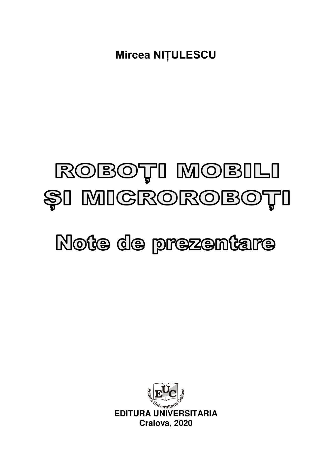 Materialul cuprins în acest volum urmărește structura generală a cursului “Roboți mobili și microroboți”, curs existent în Planul de învățământ al domeniului de licență “Mecatronică și Robotică”, atât pentru specializarea “Mecatronică” cât și pentru specializarea “Robotică” în ultimul semestru de studii. Elaborat pe baza unei experiențe didactice dobândită pe parcursul a mai multor ani de predare, el aduce un ansamblu de noțiuni și de cunoștințe suplimentare bazate pe elementele acumulate prin diferite discipline parcurse în semestrele anterioare. Conform programei analitice și spațiului de predare alocat în prezent, materialul este structurat în douăzeci de subiecte tematice.