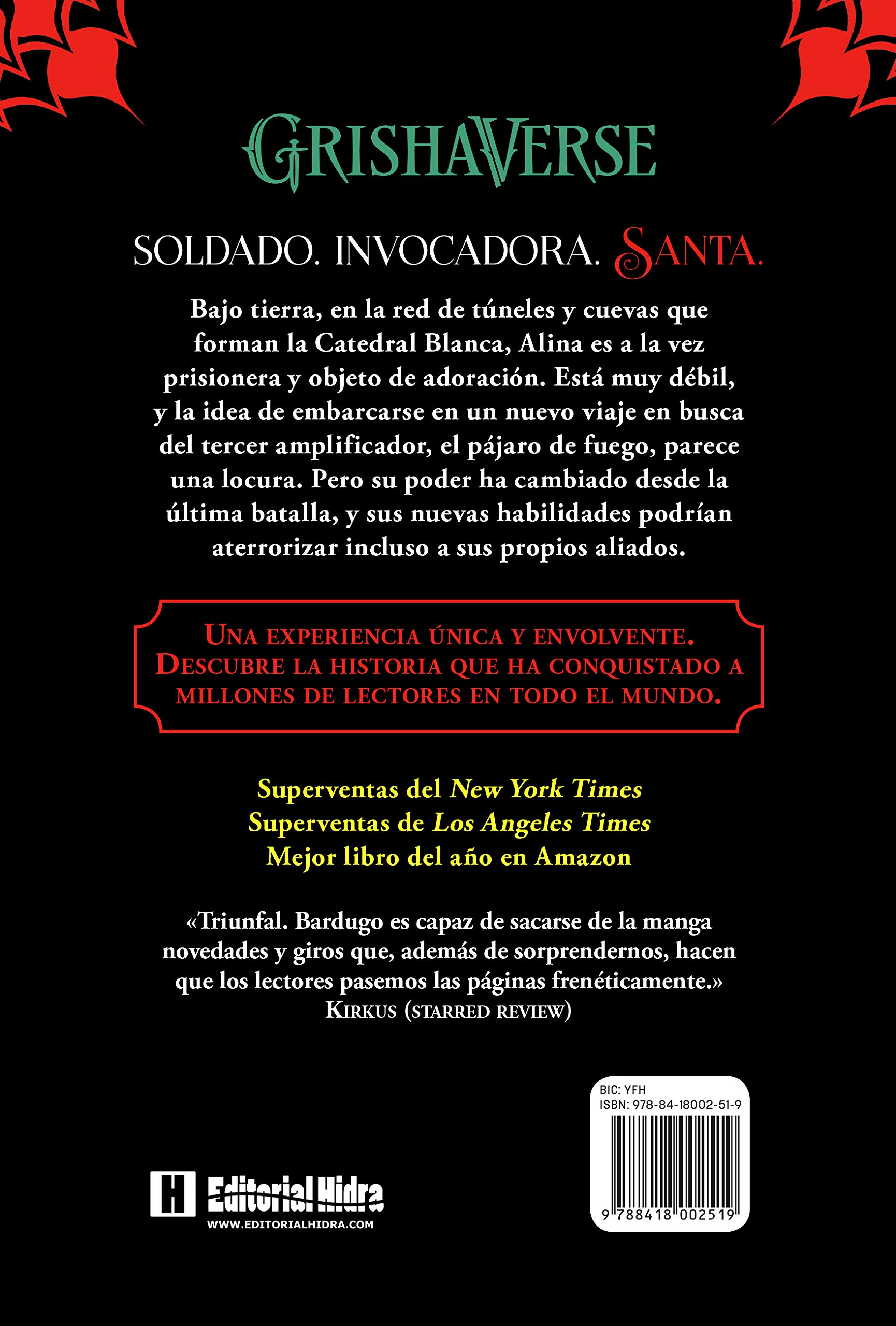 "¡La conclusión de la trilogía Grisha, de Leigh Bardugo, autora número 1 del new york times! bajo tierra, en la red de túneles y cuevas que forman la catedral blanca, Alina es a la vez prisionera y objeto de adoración. Está muy débil, y la idea de embarcarse en un nuevo viaje en busca del tercer amplificador, el pájaro de fuego, parece una locura. Pero su poder ha cambiado desde la última batalla, y sus nuevas habilidades podrían aterrorizar incluso a sus propios aliados. La capital ha caído. El oscuro gobierna Ravka desde su trono de sombras. Ahora el destino de la nación está en manos de una Invocadora del Sol sin poderes, un rastreador caído en desgracia y los últimos vestigios de lo que alguna vez fue un gran ejército de magos. En las profundidades de una antigua red de túneles y cuevas, una debilitada Alina debe someterse a la dudosa protección del Apparat y de aquellos que la veneran como a una Santa. Pero tiene otros planes, como lanzarse a la caza del elusivo pájaro de fuego y comprobar si la supervivencia de cierto príncipe forajido es algo más que una esperanza. Alina deberá forjar nuevas alianzas y dejar de lado antiguas rivalidades para, junto con Mal, encontrar el último amplificador de Morozova. Pero tan pronto como empieza a desvelar los secretos del Oscuro, sale a la luz un pasado que alterará para siempre su visión del lazo que los une y el poder que ella detenta. El pájaro de fuego es lo único que se interpone entre Ravka y la destrucción, y Alina podría pagar un alto precio por conseguirlo: el mismísimo futuro por el que está luchando."