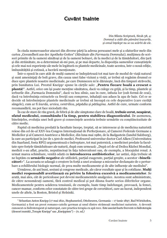 As dori acum sa pun la dispozitia bolnavilor forta vindecatoare si actiunea unor plante importante, având in vedere experienta mea din ultimii doi ani si jumatate, adica din timpul scurs de la aparitia cartii „Sanatate din Farmacia Domnului“ (editia I), si sa le ofer o mâna de ajutor pentru a se insanatosi. Este inaltator ca omul sa poata iesi din deznadejdea pricinuita de boala prin propriile sale forte si prin propria sa vointa, gratie ajutorului divin al plantelor noastre medicinale. A-ti recuceri sanatatea, a purta singur aceasta raspundere ridica demnitatea omului intr-o masura care il scoate pe bolnav din lipsa de speranta a vietii sale.