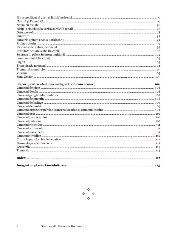Nu in ultimul rând, in paginile cartii, veti gasi recomandari pentru afectiuni maligne (boli canceroase), precum: cancerul de piele, cancerul de sân, cancerul laringelui, cancerul osos, cancerul pulmonar, cancerul renal, cancerul tiroidian etc.
