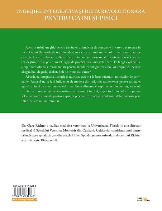 Aveți în mână un ghid pentru sănătatea animalelor de companie în care sunt trecute în revistă tehnicile medicale tradiționale și moderne din mai multe culturi, cu accent pe cele care oferă cele mai bune rezultate. Fiecare tratament recomandat în carte se bazează pe cercetări științifice și pe ani îndelungați de practică în clinici veterinare. Pe lângă explicațiile simple sunt oferite și recomandări pentru abordarea integrativă a bolilor obișnuite, inclusiv alergii, boli de piele, diabet, boli de inimă sau cancer.