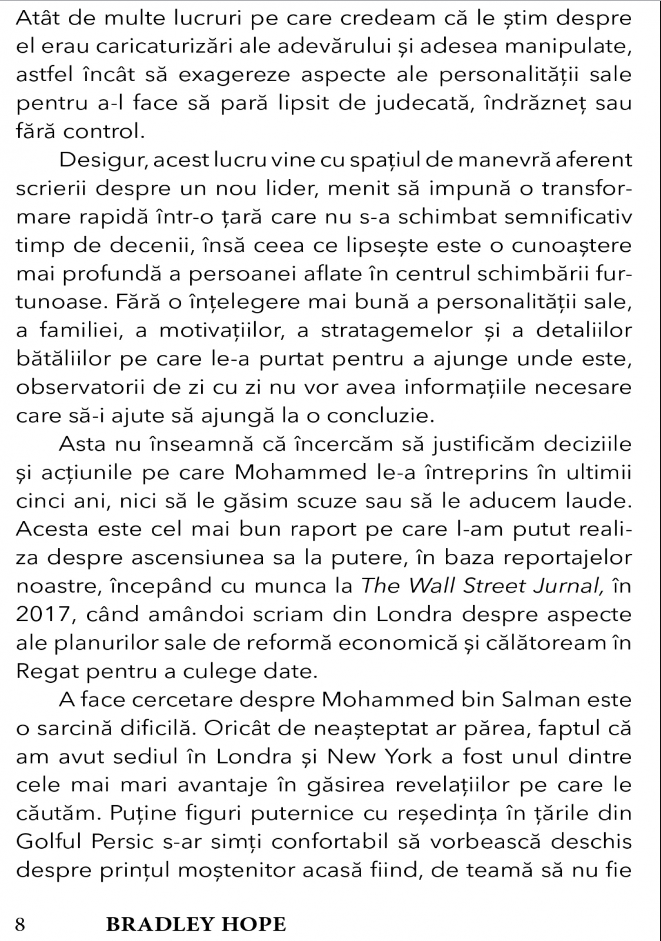 ,,Bradley Hope si Justin Scheck relateaza istoria adevarata incredibila a ascensiunii extraordinare a lui MBS, intr-o maniera multidimensionala in care o pot face doar reporterii cu experienta de la Wall Street Journal. Cartea se citeste ca un roman, dar are, in acelasi timp, rolul critic important de a pune in lumina o persoana reala care va modela lumea noastra in moduri in care am fi cu totii mai intelegatori." - Bethany McLean, autorul cartii Saudi America si coautor al cartii The Smartest Guys in the Room.