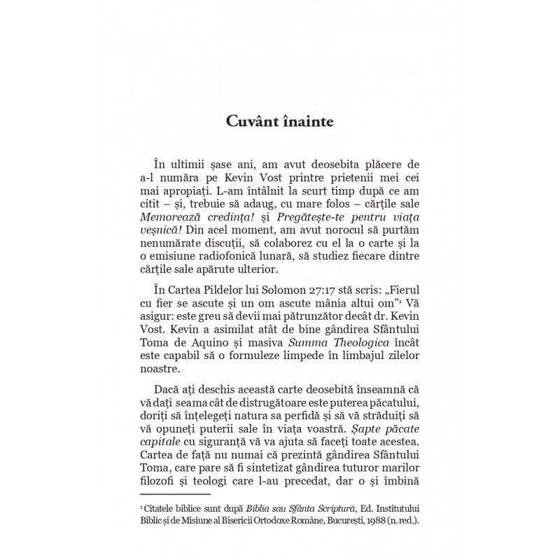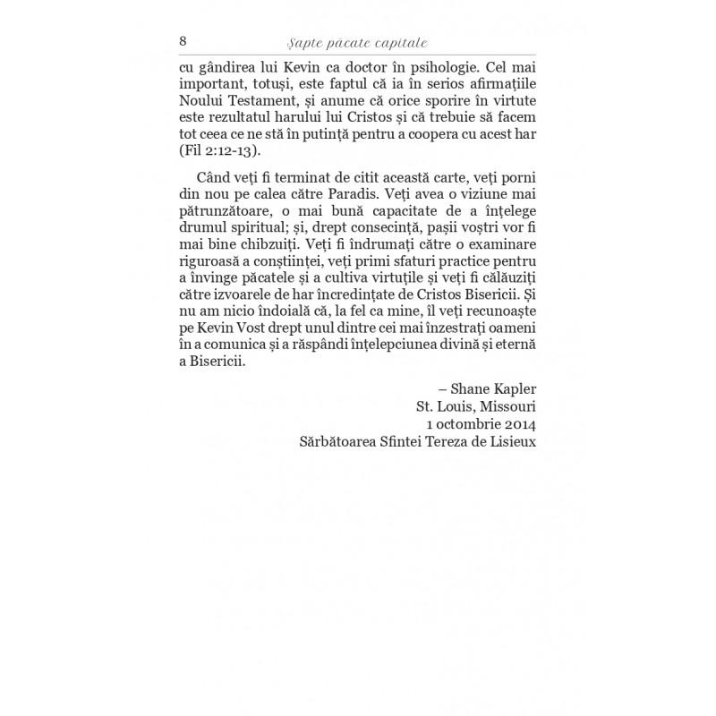 Când vei fi terminat de citit această carte, vei recunoaște din nou calea către paradis. Vei avea o viziune mai pătrunzătoare, o mai pronunțată capacitate de a evalua câmpul spiritual; și, ca rezultat, pașii tăi vor fi mai hotărâți. Vei fi călăuzit către o examinare pătrunzătoare a conștiinței, vei primi sfaturi practice pentru a învinge păcatele și a cultiva virtuțile, și vei fi inițiat în mijloacele puternice ale harului pe care Cristos le-a încredințat Bisericii. Și nu am nici o îndoială că, la fel ca și mine, îl vei recunoaște pe dr. Kevin Vost ca pe unul dintre cei mai înzestrați transmițători ai înțelepciunii divine și veșnice a Bisericii.