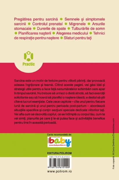 Sarcina este un motiv de fericire pentru viitorii parinti, dar provoaca adesea ingrijorare si teama. Citind aceste pagini, vei gasi idei si strategii utile pentru a face fata nenumaratelor schimbari care apar in timpul sarcinii. Nu trebuie sa urmezi o dieta stricta, sa faci exercitii solicitante sau sa incerci sa planifici o nastere ideala; e destul sa stii citeva lucruri esentiale. Cele zece capitole – cite unul pentru fiecare luna de sarcina si unul pentru perioada post-partum – abordeaza situatiile specifice si contin sectiuni speciale dedicate viitorilor tati. Vei afla cum se dezvolta copilul, ce se intimpla cu corpul tau, cum te vei simti, planurile pe care ti le-ai putea face si activitatile benefice pentru tine in aceasta perioada.