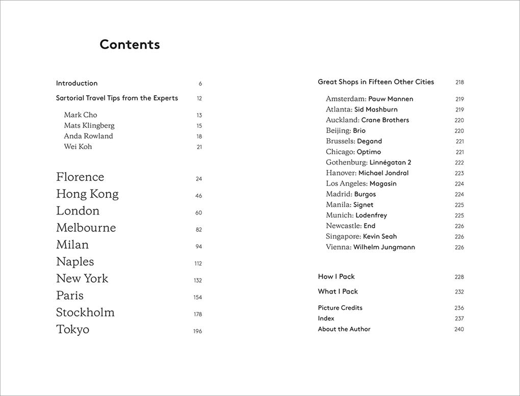 Introduction • Florence • Hong Kong • London • Melbourne • Milan • Paris • Naples • New York • Stockholm • Tokyo • In Brief: Amsterdam; Atlanta; Auckland; Beijing; Brussels; Chicago; Gothenburg; Hanover; Los Angeles; Madrid; Manila; Munich; Newcastle; Singapore; Vienna • Sartorial Travel Tips from the Experts • What to Pack