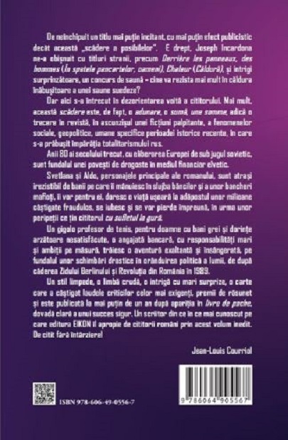De neînchipuit un titlu mai puțin incitant, cu mai puțin efect publicistic decât această „scădere a posibilelor”. E drept, Joseph Incardona ne-a obișnuit cu titluri stranii, precum Derrière les panneaux, des hommes (În spatele pancartelor, oameni), Chaleur (Căldură), și intrigi surprinzătoare, un concurs de saună – cine va rezista mai mult în căldura înăbușitoare a unei saune suedeze? Dar aici s-a întrecut în dezorientarea voită a cititorului. Mai mult, această scădere este, de fapt, o adunare, o sumă, une somme, adică o trecere în revistă, în ascunzișul unei fi cțiuni palpitante, a fenomenelor sociale, geopolitice, umane specifi ce perioadei istorice recente, în care s-a prăbușit împărăția totalitarismului rus. Anii 80 ai secolului trecut, cu eliberarea Europei de sub jugul sovietic, sunt fundalul unei povești de dragoste în mediul fi nanciar elvetic. Svetlana și Aldo, personajele principale ale romanului, sunt atrași irezistibil de banii pe care îi mânuiesc în slujba băncilor și a unor bancheri mafi oți, îi vor pentru ei, doresc o viață ușoară la adăpostul unor milioane câștigate fraudulos, se iubesc și se vor pierde împreună, în urma unor peripeții ce țin cititorul cu sufl etul la gură. Un gigolo profesor de tenis, pentru doamne cu bani grei și dorințe arzătoare nesatisfăcute, o angajată bancară, cu responsabilități mari și ambiții pe măsură, trăiesc o aventură exaltantă și însângerată, pe fundalul unor schimbări drastice în orânduirea politică a lumii, de după căderea Zidului Berlinului și Revoluția din România în 1989. Un stil limpede, o limbă crudă, o intrigă cu mari surprize, o carte care a câștigat laudele criticilor celor mai exigenți, premii de răsunet și este publicată la mai puțin de un an după apariția în livre de poche, dovadă clară a unui succes sigur. Un scriitor din ce în ce mai cunoscut pe care editura EIKON îl apropie de cititorii români prin acest volum inedit. De citit fără întârziere! (Jean-Louis Courriol)