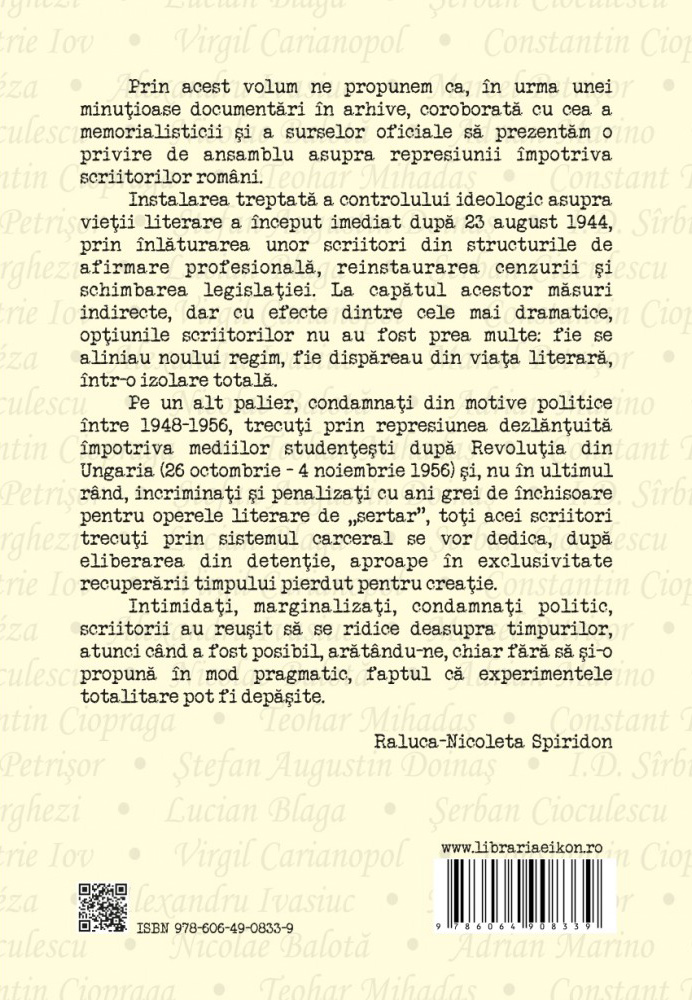 „Scriitorii români între refuzul compromisului și adaptare. Excludere socială și condamnare politică (1944-1964) a încercat, în urma unei documentări în arhive, coroborată cu memorialistica și sursele oficiale să realizeze o privire de ansamblu asupra represiunii împotriva scriitorilor români. În opinia noastră, represiunea împotriva intelectualilor în perioada 1944-1964 a fost sincronă contextului politic extern și intern care a generat-o, ceea ce face ca acest interval de timp să fie împărțit cu destul de multă ușurință în mai multe subperioade, fiecare cu particularitățile sale. Se poate astfel considera că în perioada 1944-1948, Partidul Comunist, prin intermediul pârghiilor guvernamentale pe care le-a deținut, acționează în principal prin schimbarea legislației atât pentru a-și instala treptat controlul asupra vieții literare cât și pentru a elimina din cadrele instituționale, personalitățile considerate indezirabile paradigmei comuniste. Aceasta nu a exclus, desigur, încercarea de a atrage în rândurile partidului, intelectuali de valoare. În primul rând au fost excluși din propria lor asociație profesională acei scriitori care susținuseră regimul antonescian și războiul din răsărit.”