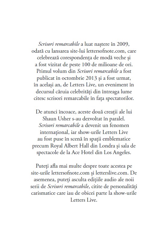 Shaun Usher este scriitor britanic și deținătorul popularelor bloguri lettersofnote.com și listsofnote.com. Îi place să colecționeze scrisori vechi și cărți frumoase și își petrece timpul căutând corespondență și întocmind liste de lucruri pe care să le împărtășească cu ceilalți. În 2009, pasiunea sa pentru scrisori vechi s‑a concretizat în lansarea website‑ului lettersofnote.com, un muzeu online vizitat de peste o sută de milioane de ori. Acestea au fost publicate patru ani mai târziu, într‑o serie tematică, devenită în scurt timp bestseller. Usher locuiește în Manchester împreună cu soția sa, Karina, și cei doi băieți ai lor.
