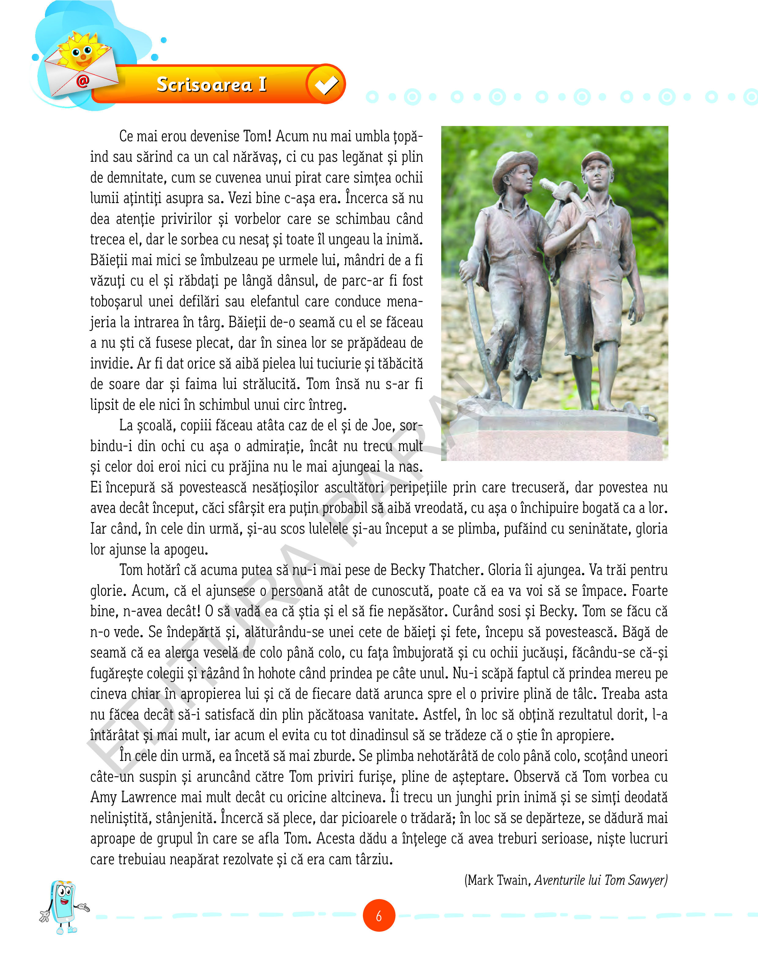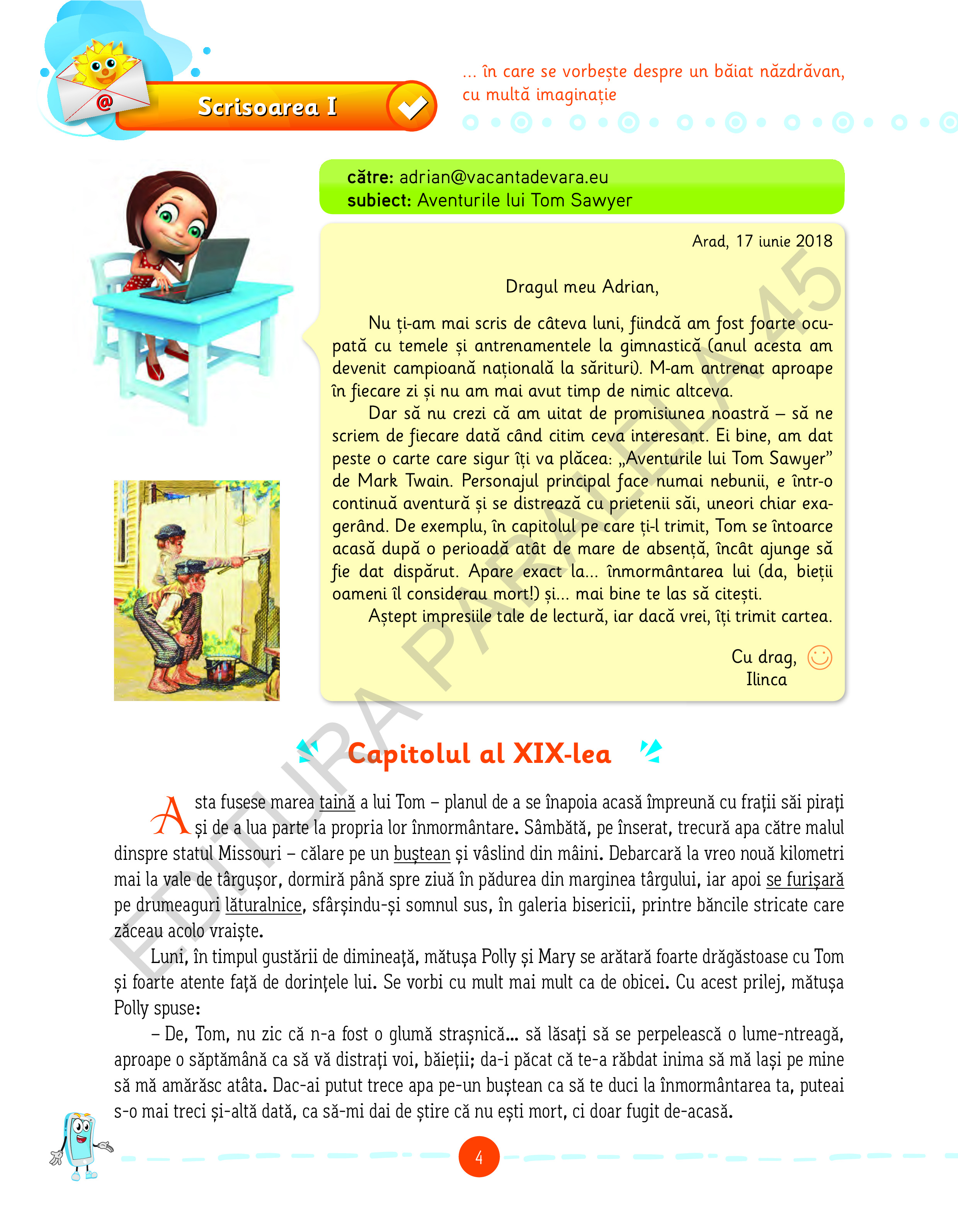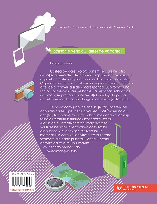 Te provocăm şi noi pe tine să ţi-i faci prieteni pe copiii din carte şi pe isteţul ghid Lecturici! Împreună cu aceştia, te vei simţi mulţumit şi bucuros când vei desluşi tainele literaturii în rubrica Descoperim textul! Alături de ei, creativitatea şi imaginaţia ta vor fi de neînvins în rezolvarea activităţilor din rubrica Mai aproape de text! Iar în momentul în care vei constata că la fiecare Scrisoare din carte punctajul obţinut pentru activitatea ta este unul maxim, vei fi foarte mândru de performanţele tale.