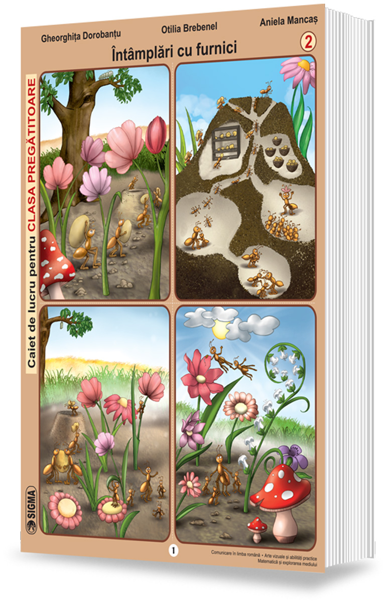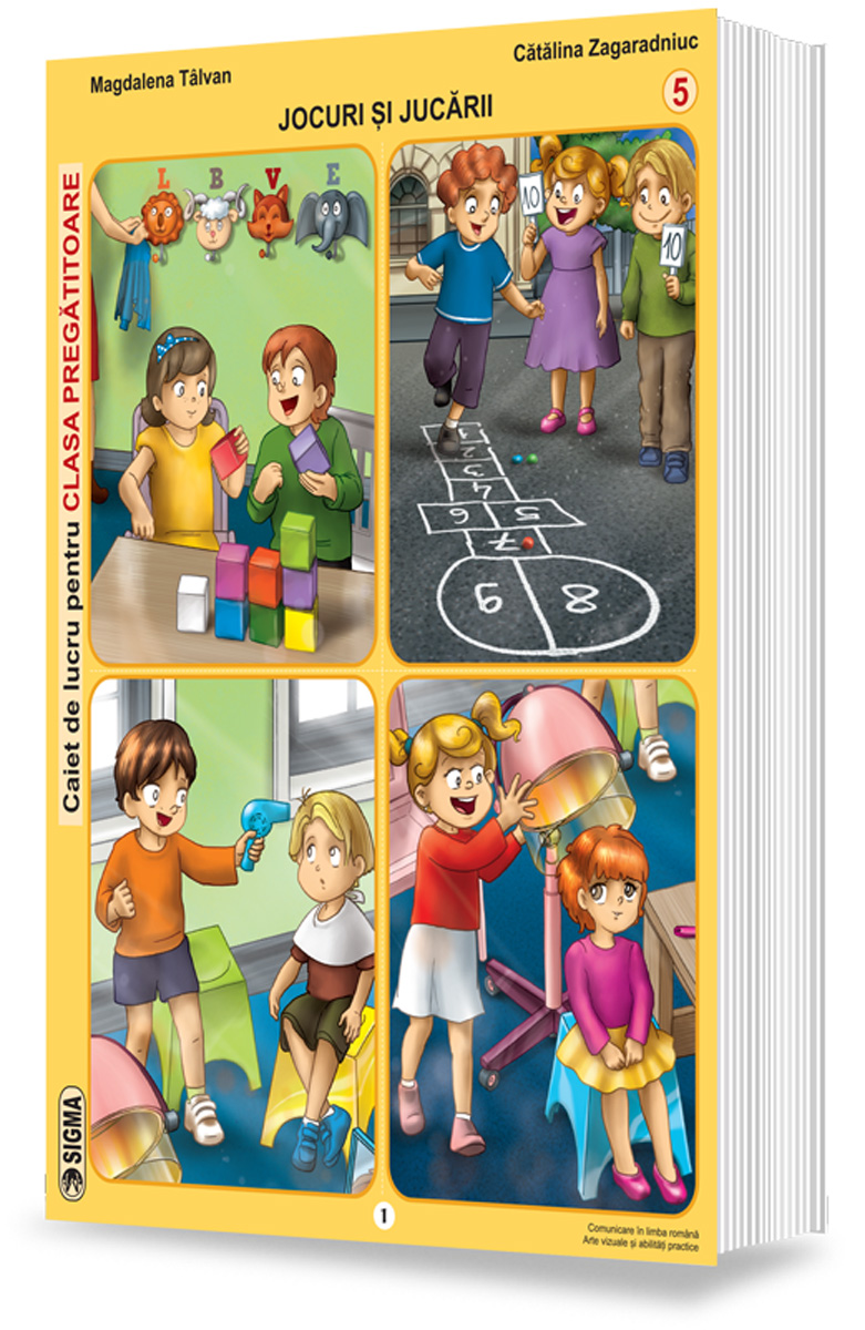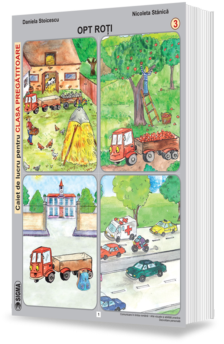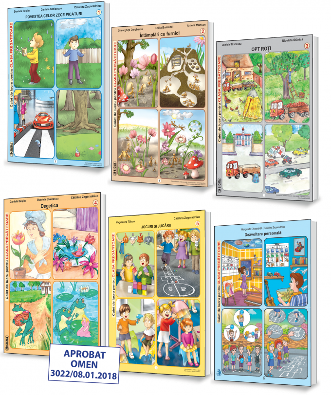 Editura Sigma ofera pentru Clasa pregatitoare, semestrul I, setul de caiete cu activitati pentru elevi care cuprinde: Povestea celor zece picaturi, Întamplari cu furnici, Opt Roti, Degetica, Jocuri si jucarii, Dezvoltare personală. Fiecare caiet contine 24 de pagini si 2 coperti cartonate, si poate fi folosit pe parcursul a patru saptamani de scoala. Pe Copertile se decupeaza si se obtin carti de joc cu: