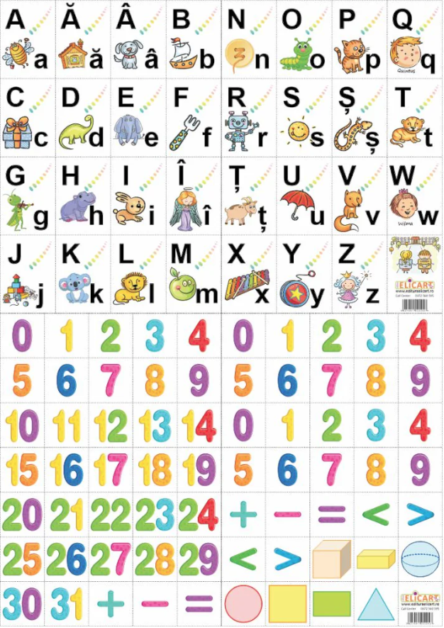 • 2 planșe cu cifre, numere, figuri și corpuri geometrice