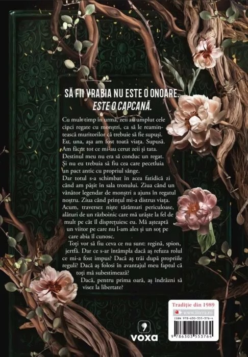 Dar totul s-a schimbat în acea fatidică zi când am pășit în sala tronului. Ziua când un vânător legendar de monștri a ajuns în regatul nostru. Ziua când prințul mi-a distrus viața. Acum, traversez niște tărâmuri periculoase, alături de un războinic care mă urăște la fel de mult pe cât îl disprețuiesc eu. Mă așteaptă un viitor pe care nu l-am ales și un soț pe care abia îl cunosc.