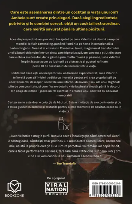 Finalist al emisiunii Românii au talent, magician al transformării unei băuturi obișnuite într-un show care hipnotizează, om care nu a știut din start care e cheia succesului, dar a găsit-o prin multă muncă și pasiune, Luca Valentin împărtășește acum cu iubitorii de distracție și gusturi rafinate peste 70 de cocktailuri de încercat într-o viață.