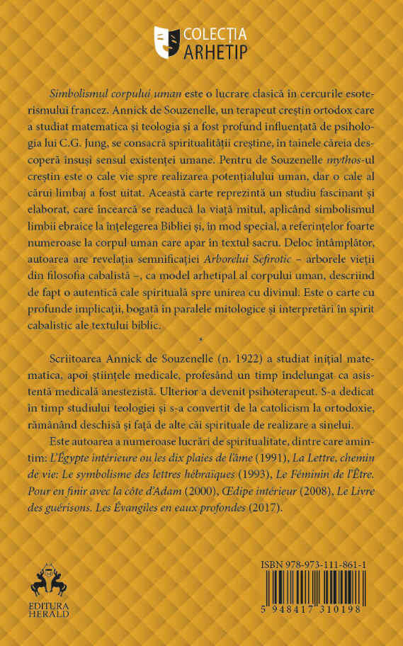 Simbolismul corpului uman este o lucrare clasica in cercurile esoterismului francez. Annick de Souzenelle, un terapeut crestin ortodox care a studiat matematica si teologia si a fost profund influentata de psihologia lui C.G. Jung, se consacra spiritualitatii crestine, in tainele careia descopera insusi sensul existentei umane.