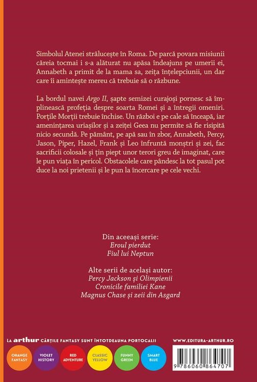 La bordul navei Argo II, şapte semizei curajoși pornesc să împlinească profeția despre soarta Romei și a întregii omeniri. Porțile Morţii trebuie închise. Un război e pe cale să înceapă, iar ameninţarea uriașilor și a zeiţei Geea nu permite să fie risipită nicio secundă. Pe pământ, pe apă sau în zbor, Annabeth, Percy, Jason, Piper, Hazel, Frank și Leo înfruntă monștri şi zei, fac sacrificii colosale și țin piept unor terori greu de imaginat, care le pun viaţa în pericol. Obstacolele care pândesc la tot pasul pot duce la noi prietenii şi le pun la încercare pe cele vechi.