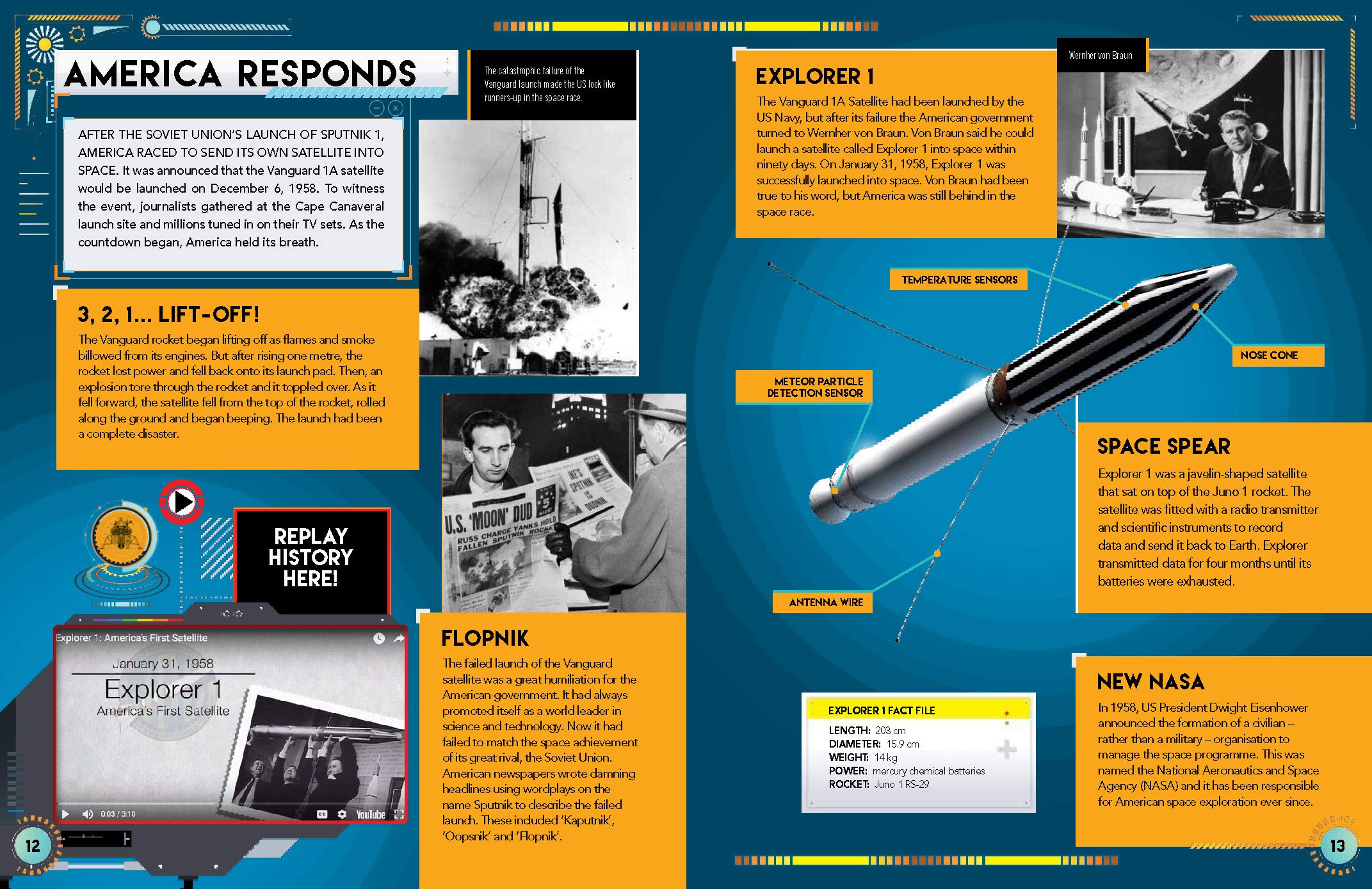 Download the free app to bring space exploration to life like no other book. See the Apollo 11 lunar module, the ISS Space Station and the Curiosity Mars rover in close-up 3D, and watch the book come to life when video clips of NASA footage play 'on the page' when viewed through your smartphone or tablet. This richly illustrated, immersive experience tells the awe-inspiring story of space exploration, looking back in time to the first satellites that were sent into orbit and forward to future missions to Mars. Photographic features highlight key spacecraft such as Vostock 1, the International Space Station, the Space Shuttle and the Hubble Space Telescope.
