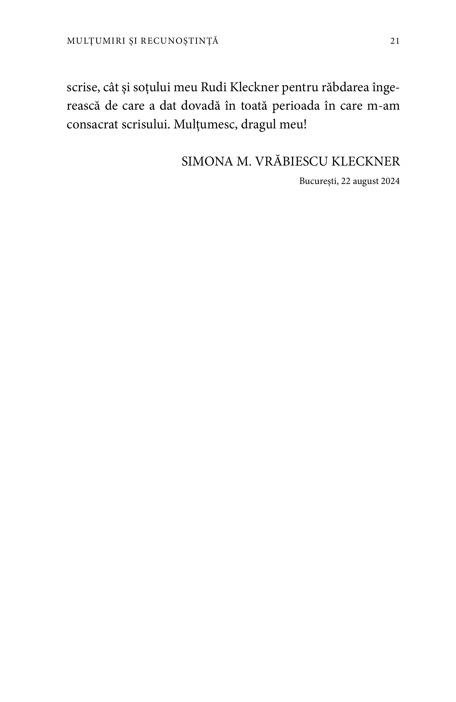 SIMONA M. VRĂBIESCU KLECKNER (n. 1927) este descendenta unei ilustre familii românești, fiică și respectiv nepoată a lui George Vrăbiescu și Nicolae Vrăbiescu, remarcabili juriști din perioada interbelică, și nepoată prin alianță a marelui profesor latinist Nicolae Herescu. A absolvit ea însăși Facultatea de Drept la Universitatea din București în 1949, fără să poată vreodată profesa în domeniu înainte de a părăsi, în 1965, România comunistă. În Statele Unite, unde a emigrat, a obținut două masterate, unul în informatică, la Columbia University, în 1969, iar celălalt în drept internațional public, la New York University, în 1973.