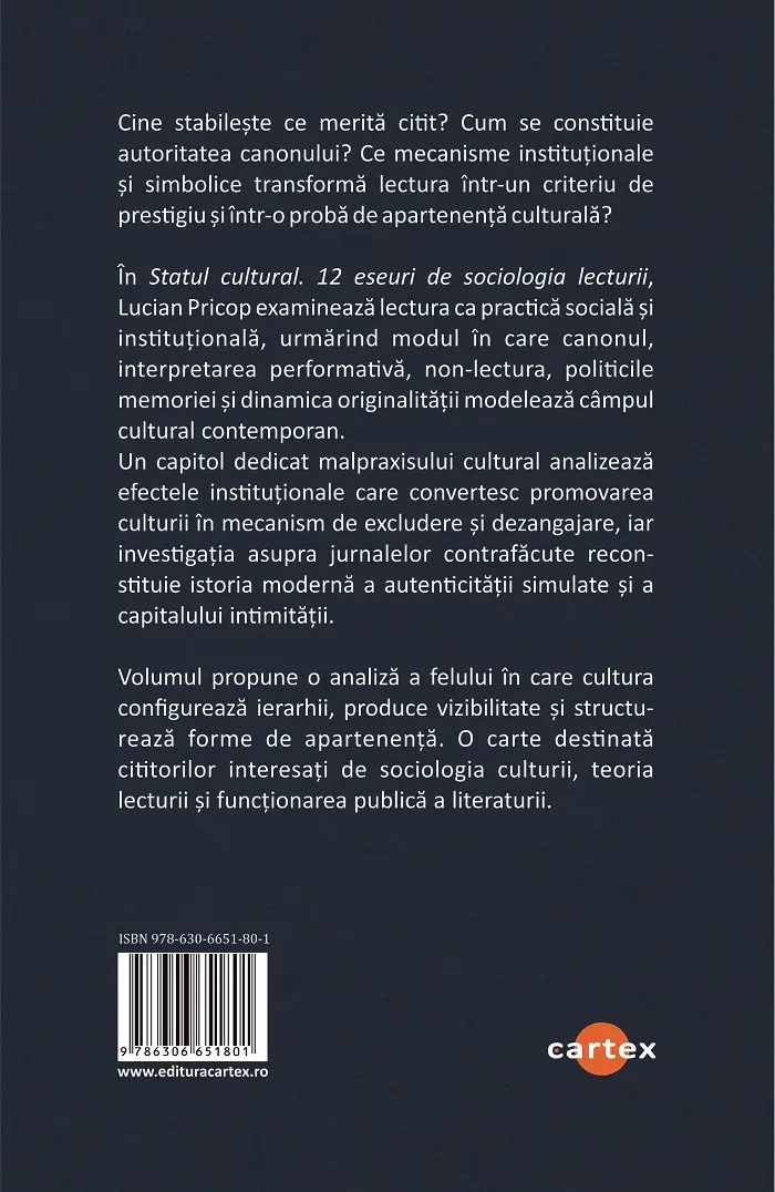 In „Statul cultural. 12 eseuri de sociologia lecturii“, Lucian Pricop (cercetator, profesor, editor si traducator) propune o radiografie lucida si provocatoare a modului in care cultura functioneaza ca sistem de putere si legitimare. Cartea arata cum valoarea literara este descoperita, dar si construita prin mecanisme institutionale, discurs critic si strategii de vizibilitate care modeleaza ierarhiile simbolice ale prezentului. Cu rigoare analitica si claritate conceptuala, volumul exploreaza teme actuale precum non-lectura, politicile memoriei, mitologia originalitatii si economia autenticitatii. Un capitol dedicat malpraxisului cultural dezvaluie felul in care promovarea culturii poate deveni instrument de excludere, iar analiza jurnalelor contrafacute reconstituie istoria moderna a autenticitatii simulate.