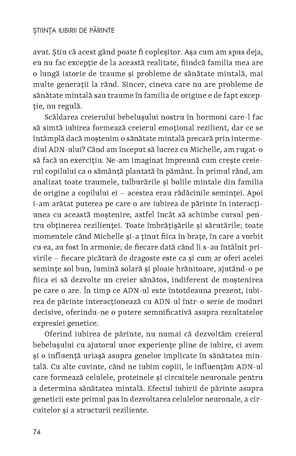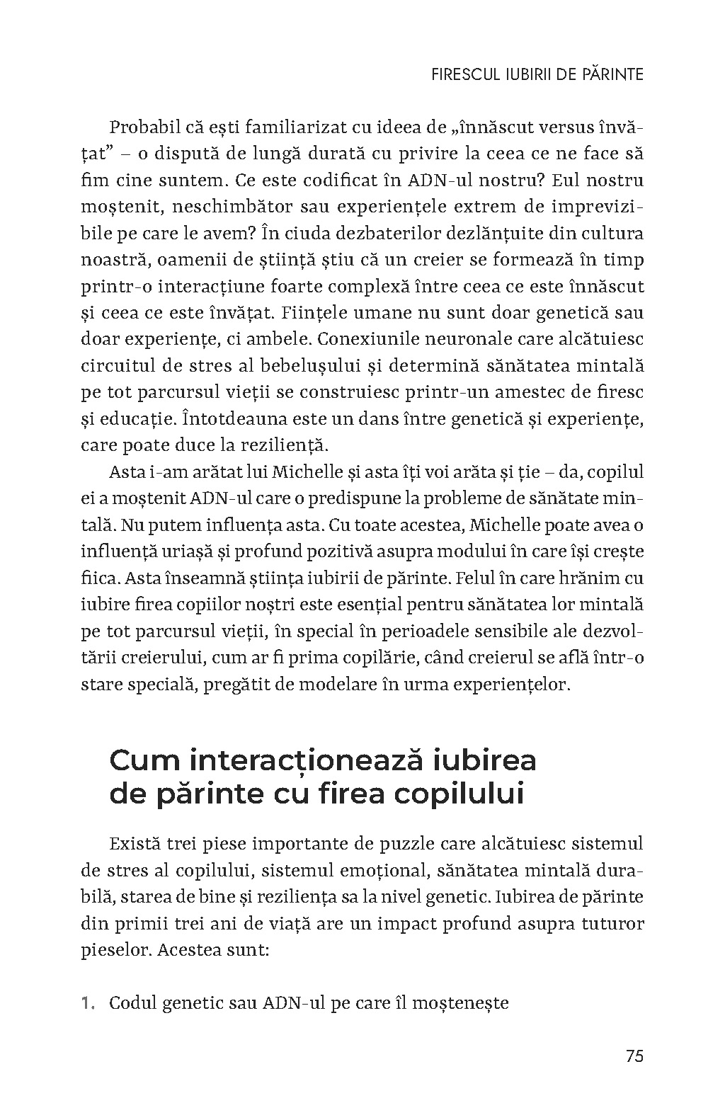 Îngrijirea iubitoare pe care bebelușii o primesc de la părinții lor în primii trei ani de viață le poate influența decisiv sănătatea mintală în viitor. Dr. Greer Kirshenbaum, specialistă în neuroștiințe, aduce numeroase dovezi științifice în sprijinul ideii că prezența, grija și iubirea părintească construiesc cea mai solidă bază pentru echilibrul psihic al copilului.