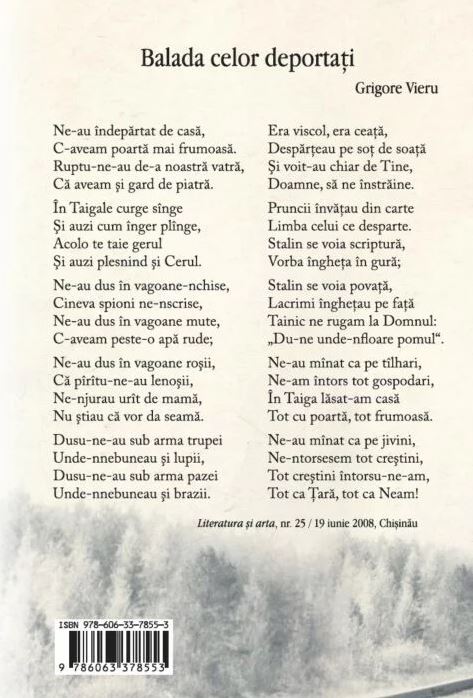 Ne-au îndepărtat de casă, C-aveam poartă mai frumoasă. Ruptu-ne-au de-a noastră vatră, Ruptu-ne-au de-a noastră vatră, Balada celor deportați- Grigore Vieru