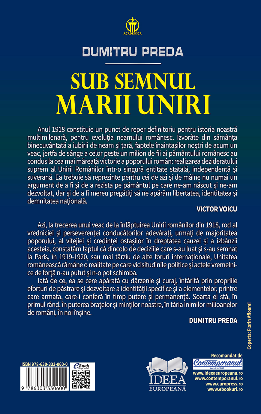 Azi, la trecerea unui veac de la înfăptuirea Unirii românilor din 1918, rod al vredniciei și perseverenței conducătorilor adevărați, urmați de majoritatea poporului, al vitejiei și credinței ostașilor în dreptatea cauzei și a izbânzii acesteia, constatăm faptul că dincolo de deciziile care s-au luat şi s-au semnat la Paris, în 1919-1920, sau mai târziu de alte foruri internaționale, Unitatea românească rămâne o realitate pe care vicisitudinile politice şi actele vremelnice de forță n-au putut şi n-o pot schimba.