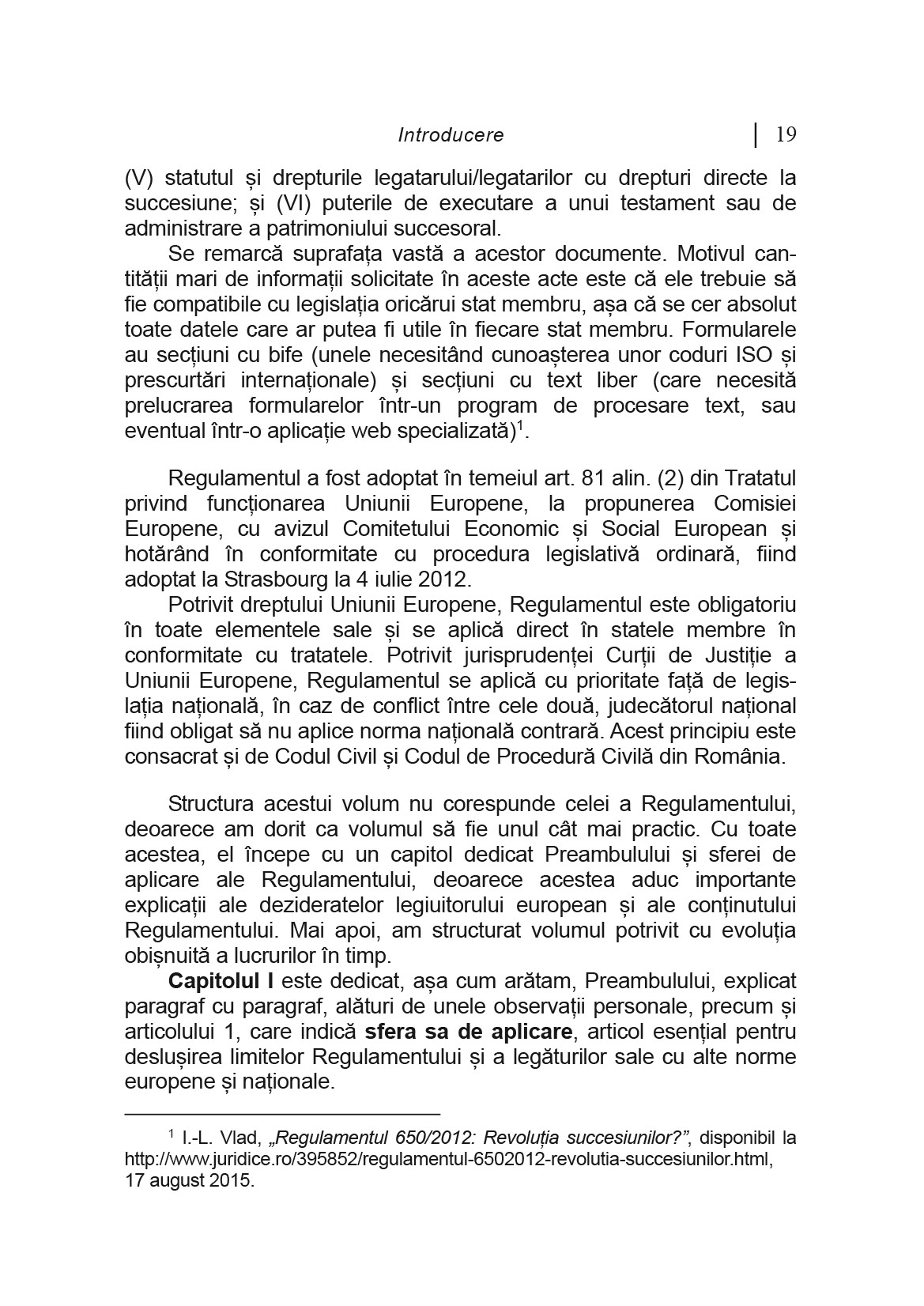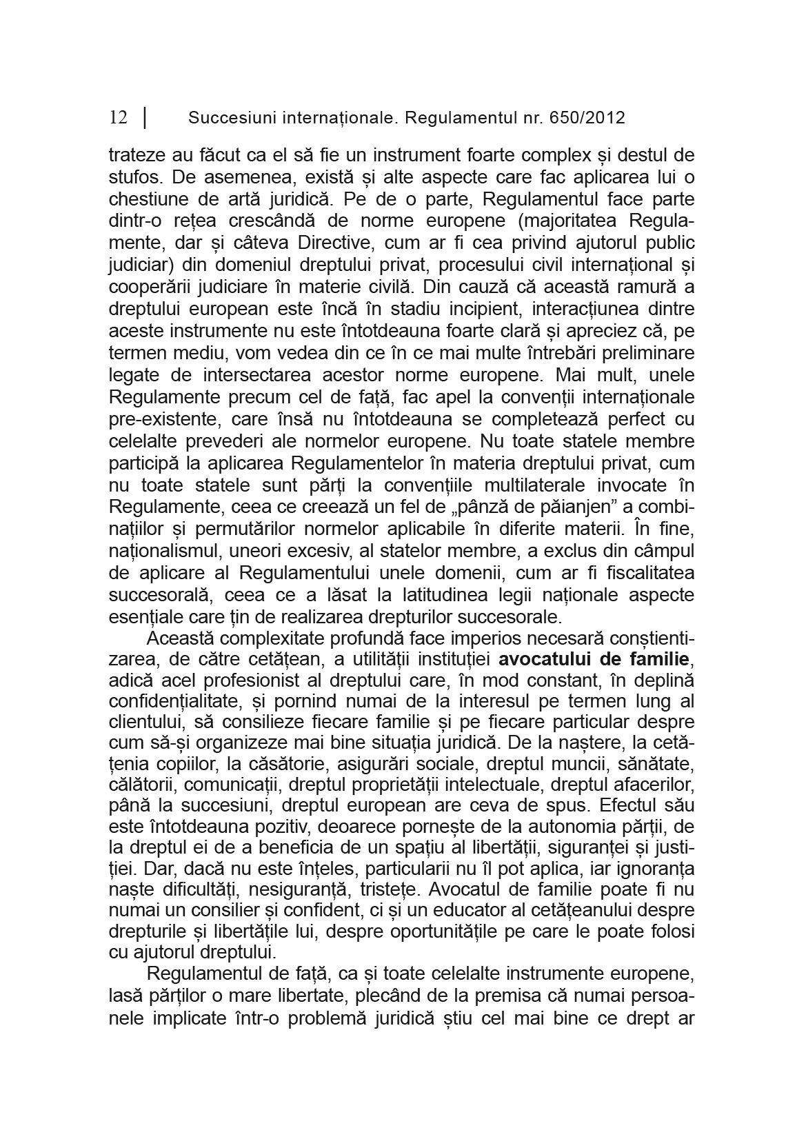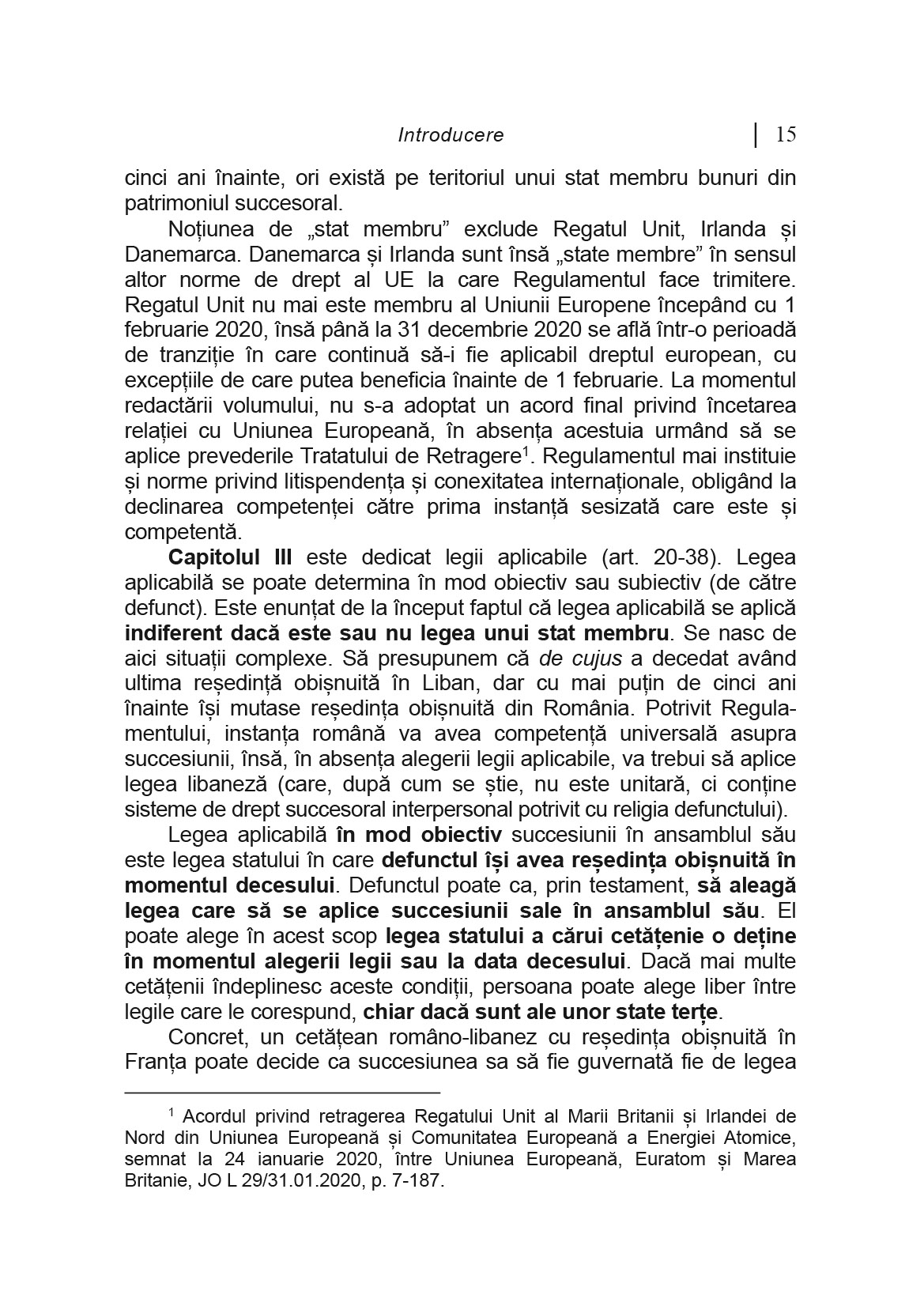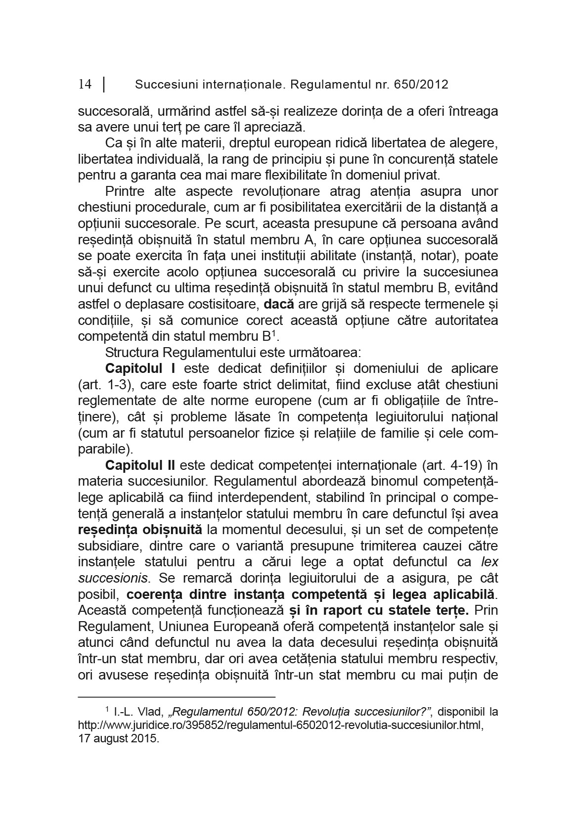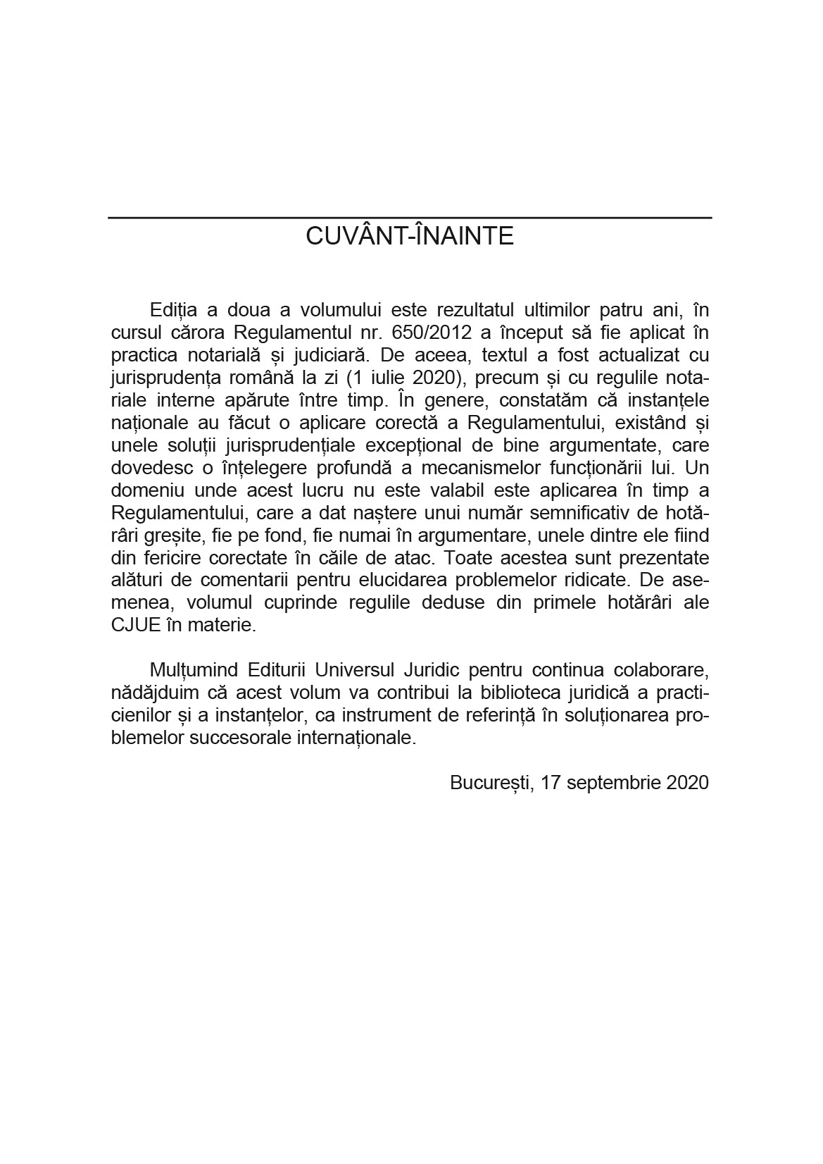 Regulamentul (UE) nr. 650/2012, aplicat de la 17 august 2015, a revoluționat domeniul succesiunilor cu element de extraneitate. Volumul de față explică, din punct de vedere teoretic și practic, noua reglementare și oferă soluții practice pentru depășirea problemelor ridicate de un text nou. Problematica succesiunilor internaționale este abordată logic, de la momentul redactării testamentului, până la cel al execuțiunii succesorale, fiind indicate atât normele naționale și europene în materie, cât și tratatele bi- și multilaterale aplicabile în domeniu. Volumul face o introducere în practica planificării succesorale, necesară astăzi tuturor celor care doresc ca afacerile sau patrimoniul lor să fie transmise noilor generații în condiții de deplină siguranță juridică și întocmai cu voința lor.