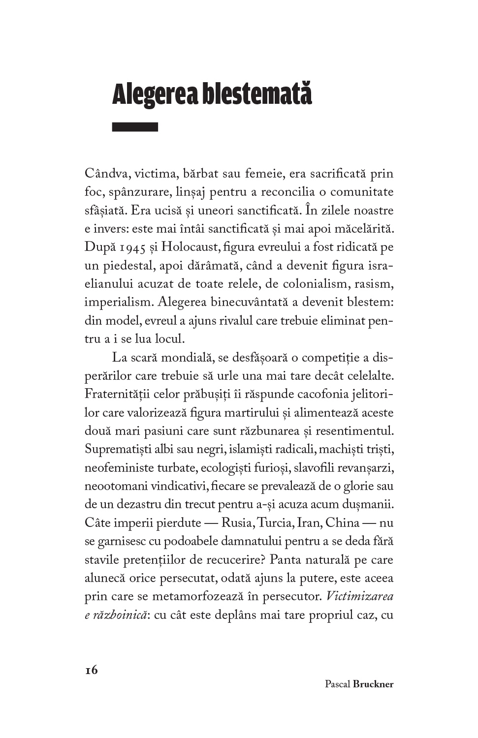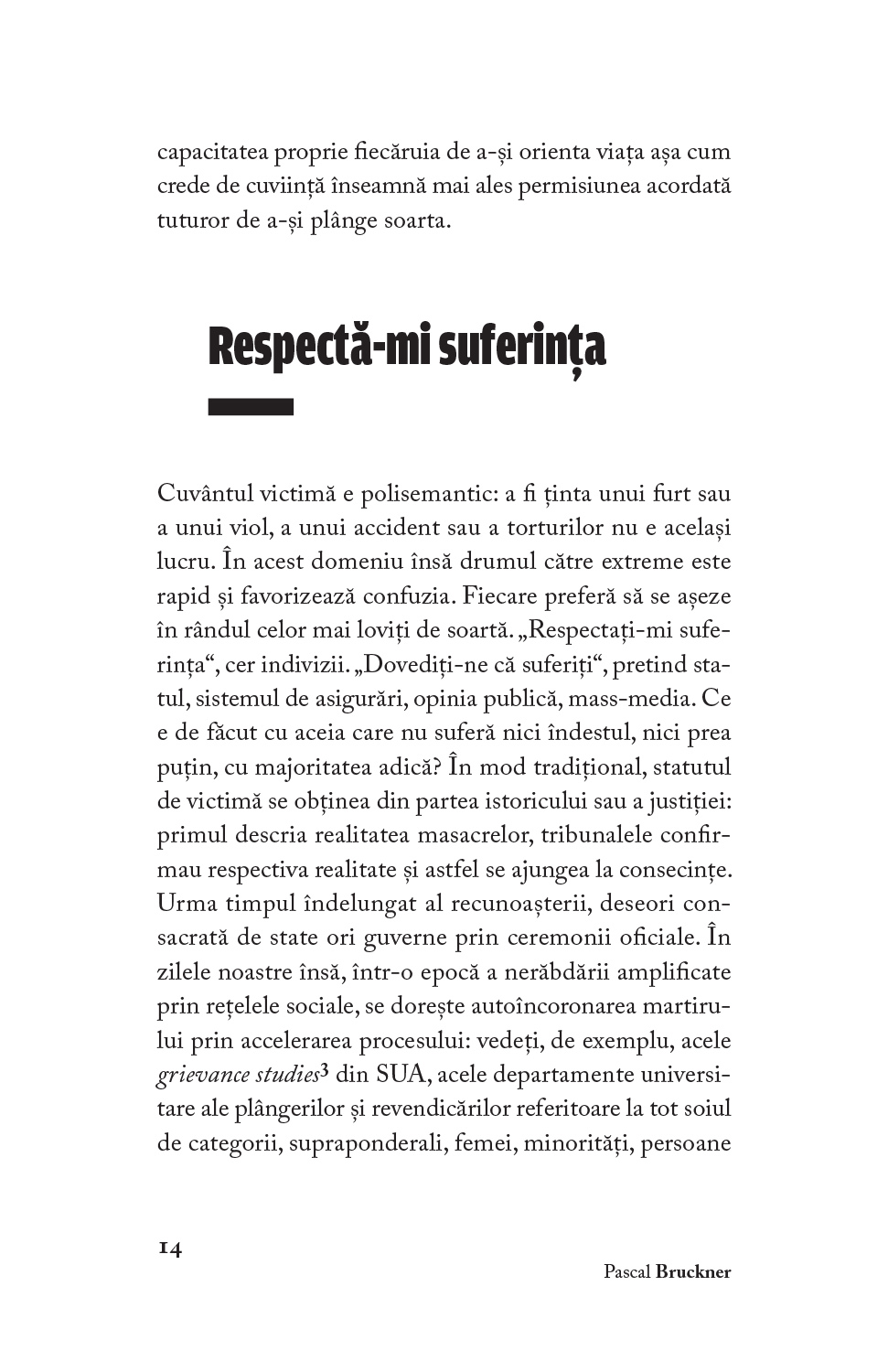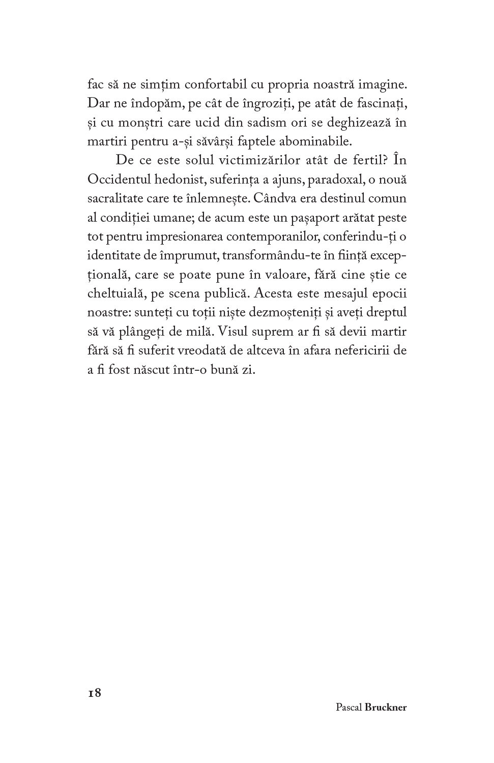 Dacă umanitatea modernităţii era mânată de dorinţa de a cuceri, astăzi ea este înlocuită de o omenire care se victimizează. Măreţia civilizaţiei constă în grija faţă de cei umiliţi. Reversul acestui progres îl reprezintă victimizarea ca formă de şantajare a celorlalţi şi patologia recunoaşterii. În Occidentul hedonist, suferinţa a devenit, în mod paradoxal, o nouă formă a sacrului. Oricine, bogat sau sărac, bărbat sau femeie, îşi flutură brevetul de damnat, care îl ridică deasupra semenilor. Acest dolorism amestecat cu amărăciune pune în valoare figura martirului şi alimentează două mari pasiuni: resentimentul şi răzbunarea. Cei fericiţi şi cei puternici vor şi ei să aparţină aristocraţiei marginilor şi să formeze noi caste ale decăzuţilor, în detrimentul celor cu adevărat nefericiţi. Pretutindeni înfloresc postura de paria, narcisismul secesiunii şi concurenţa victimizatoare.