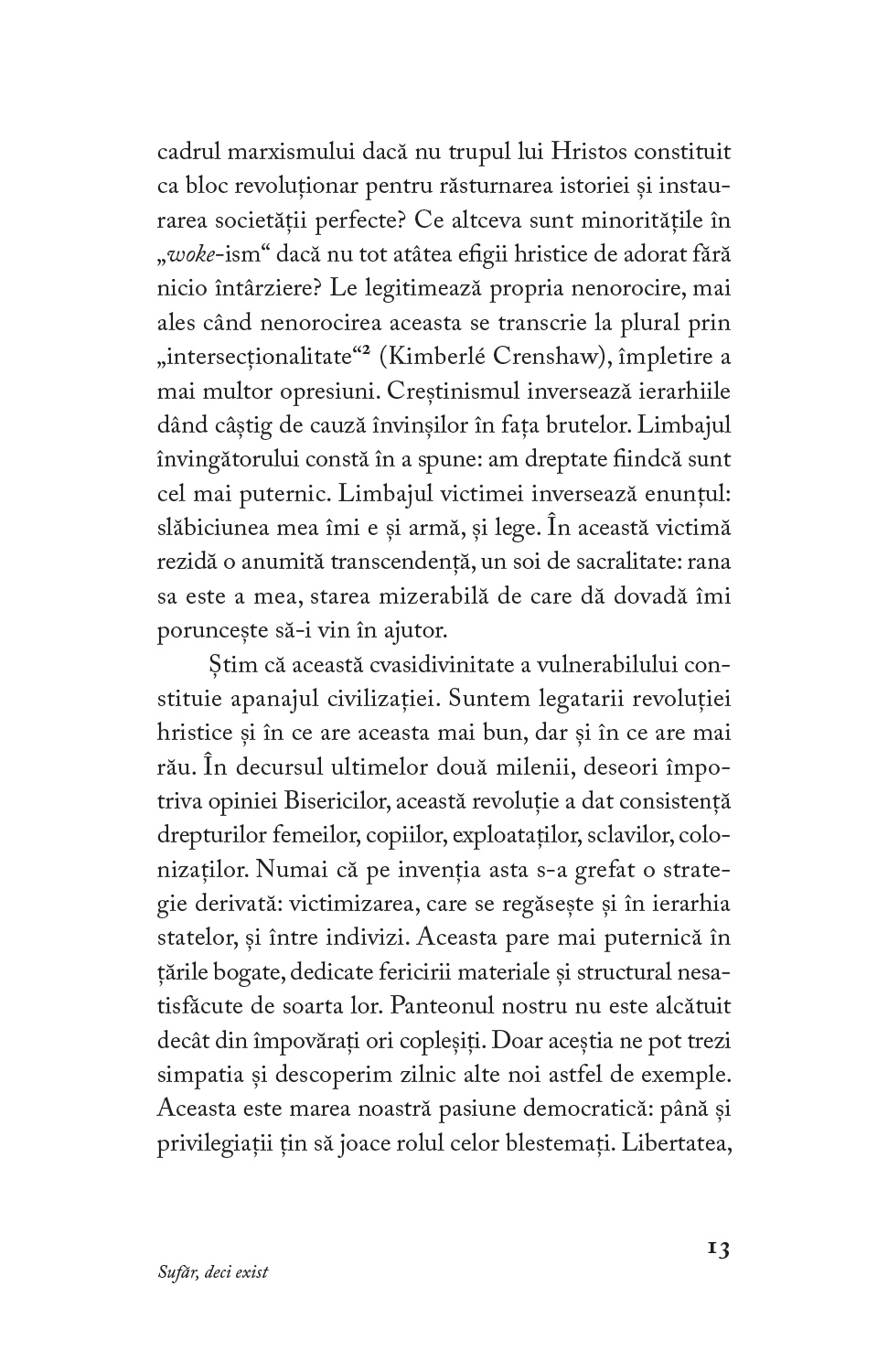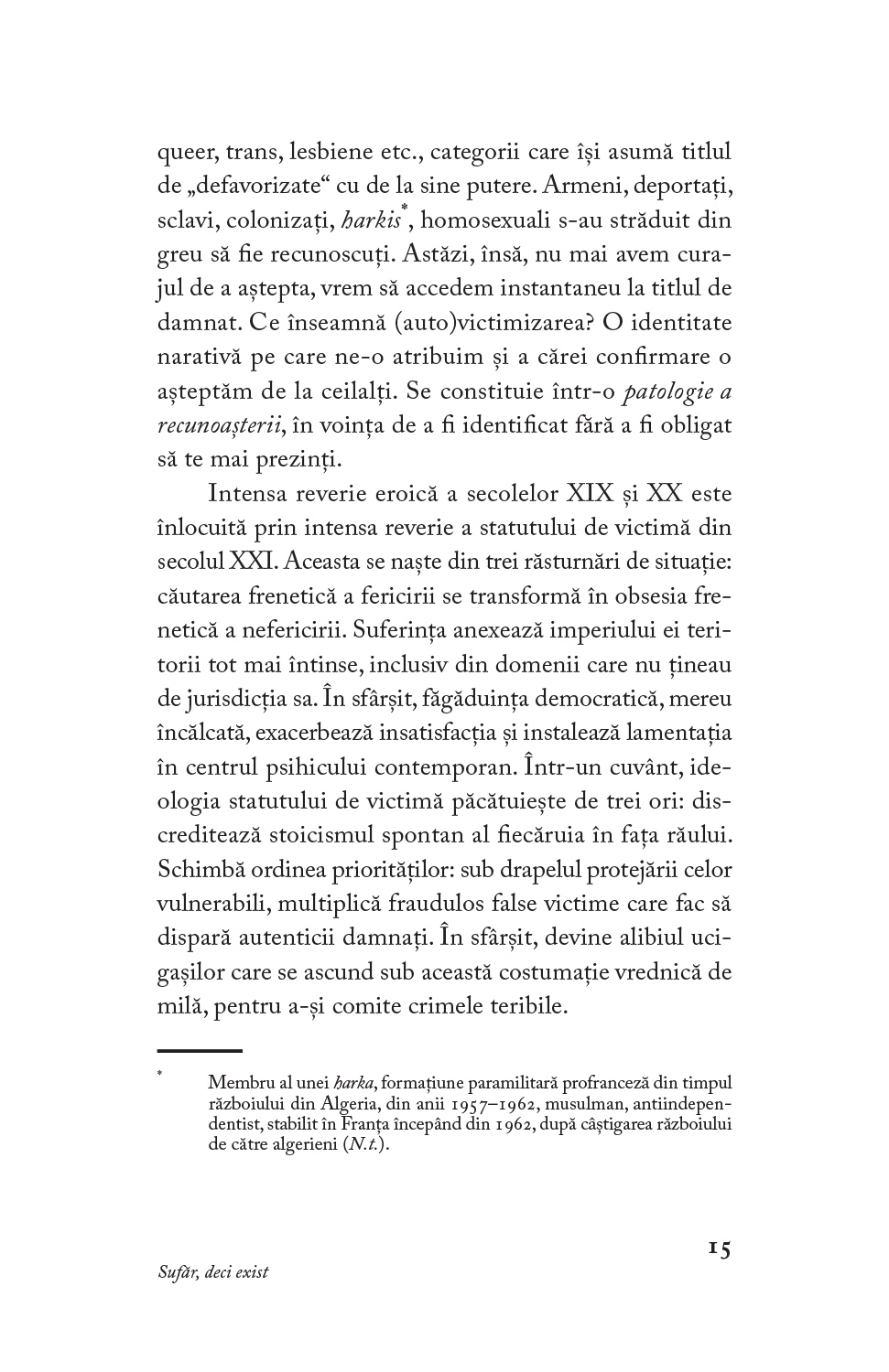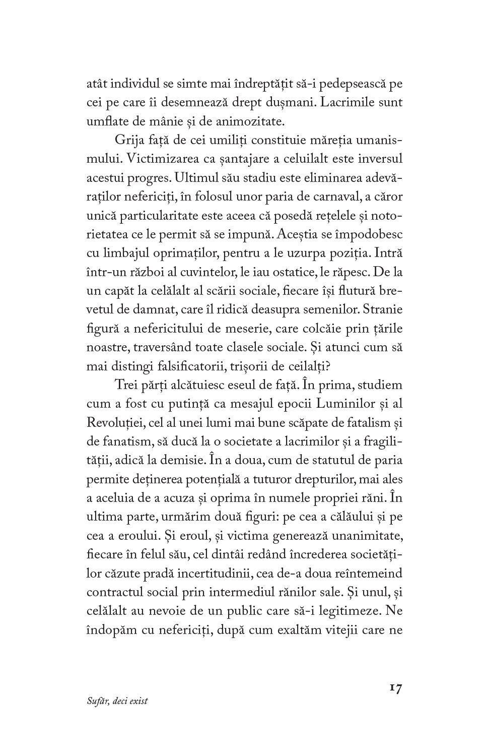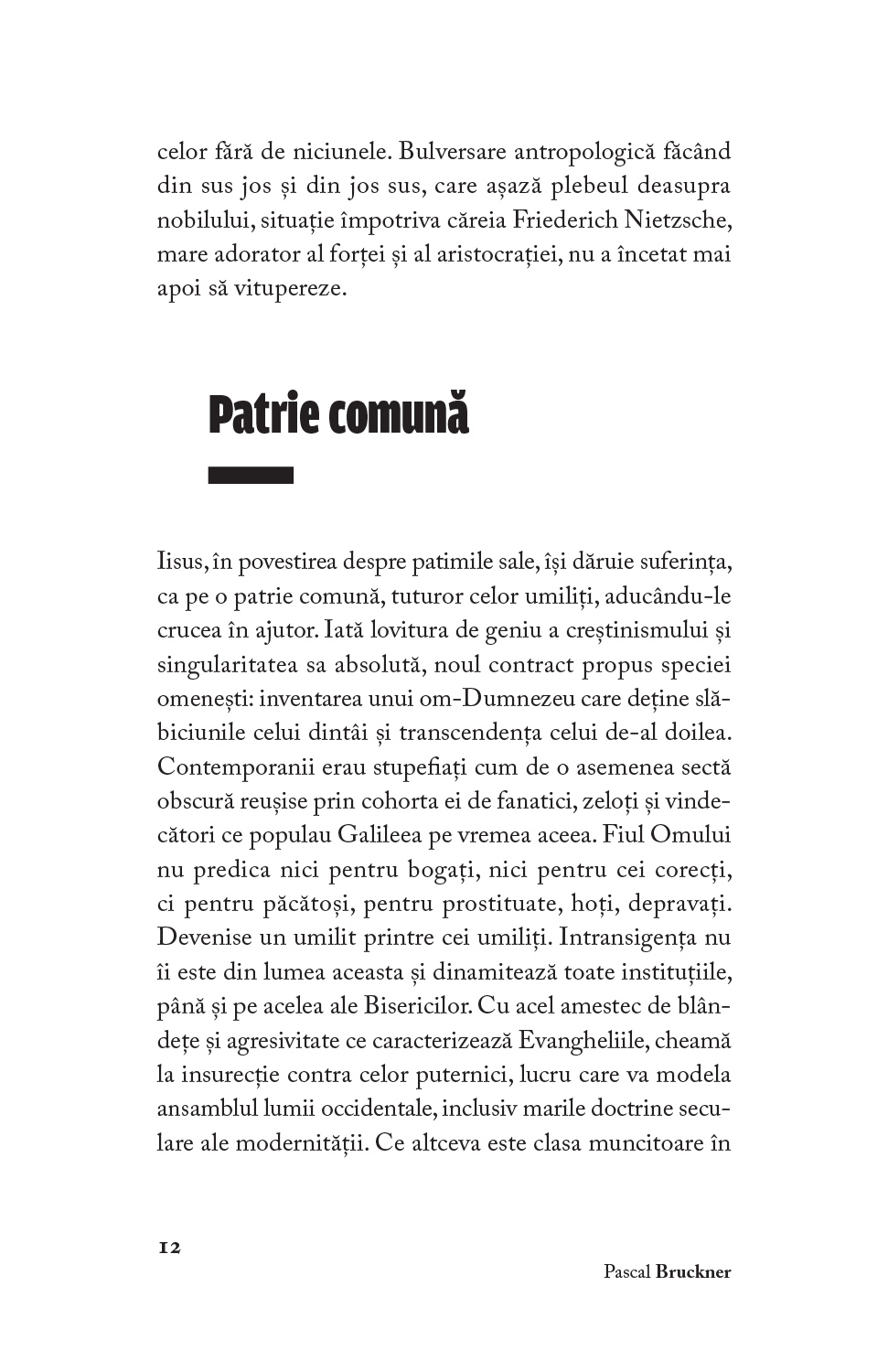 Dacă umanitatea modernităţii era mânată de dorinţa de a cuceri, astăzi ea este înlocuită de o omenire care se victimizează. Măreţia civilizaţiei constă în grija faţă de cei umiliţi. Reversul acestui progres îl reprezintă victimizarea ca formă de şantajare a celorlalţi şi patologia recunoaşterii. În Occidentul hedonist, suferinţa a devenit, în mod paradoxal, o nouă formă a sacrului. Oricine, bogat sau sărac, bărbat sau femeie, îşi flutură brevetul de damnat, care îl ridică deasupra semenilor. Acest dolorism amestecat cu amărăciune pune în valoare figura martirului şi alimentează două mari pasiuni: resentimentul şi răzbunarea. Cei fericiţi şi cei puternici vor şi ei să aparţină aristocraţiei marginilor şi să formeze noi caste ale decăzuţilor, în detrimentul celor cu adevărat nefericiţi. Pretutindeni înfloresc postura de paria, narcisismul secesiunii şi concurenţa victimizatoare.