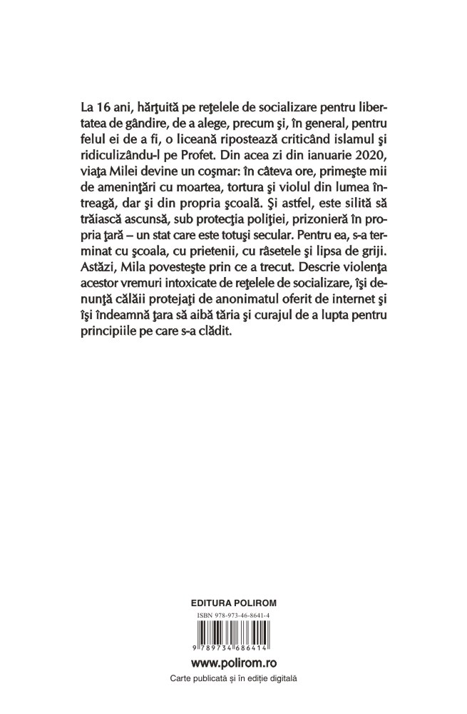 La 16 ani, hărţuită pe reţelele de socializare pentru libertatea de gîndire, de a alege, precum şi, în general, pentru felul ei de a fi, o liceană ripostează criticînd islamul şi ridiculizîndu-l pe Profet. Din acea zi din ianuarie 2020, viaţa Milei devine un coşmar: în cîteva ore, primeşte mii de ameninţări cu moartea, tortura şi violul din lumea întreagă, dar şi din propria şcoală. Şi astfel, este silită să trăiască ascunsă, sub protecţia poliţiei, prizonieră în propria ţară – un stat care este totuşi secular. Pentru ea, s-a terminat cu şcoala, cu prietenii, cu rîsetele şi lipsa de griji. Astăzi, Mila povesteşte prin ce a trecut. Descrie violenţa acestor vremuri intoxicate de reţelele de socializare, îşi denunţă călăii protejaţi de anonimatul oferit de internet şi îşi îndeamnă ţara să aibă tăria şi curajul de a lupta pentru principiile pe care s-a clădit.