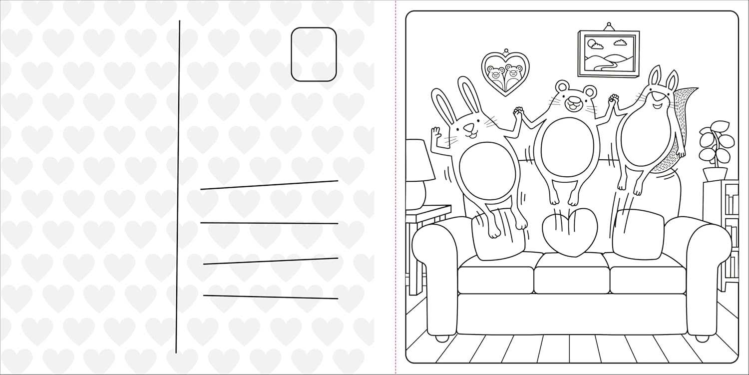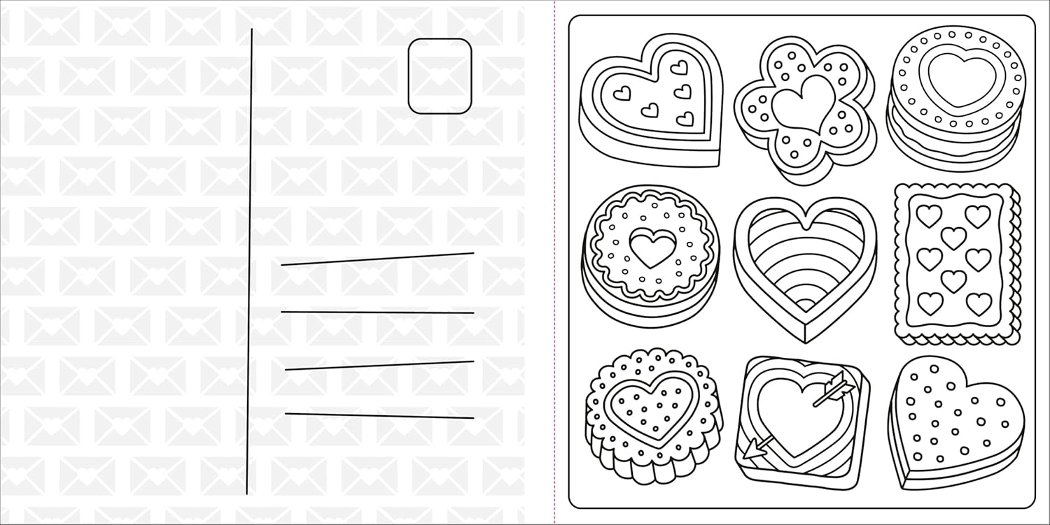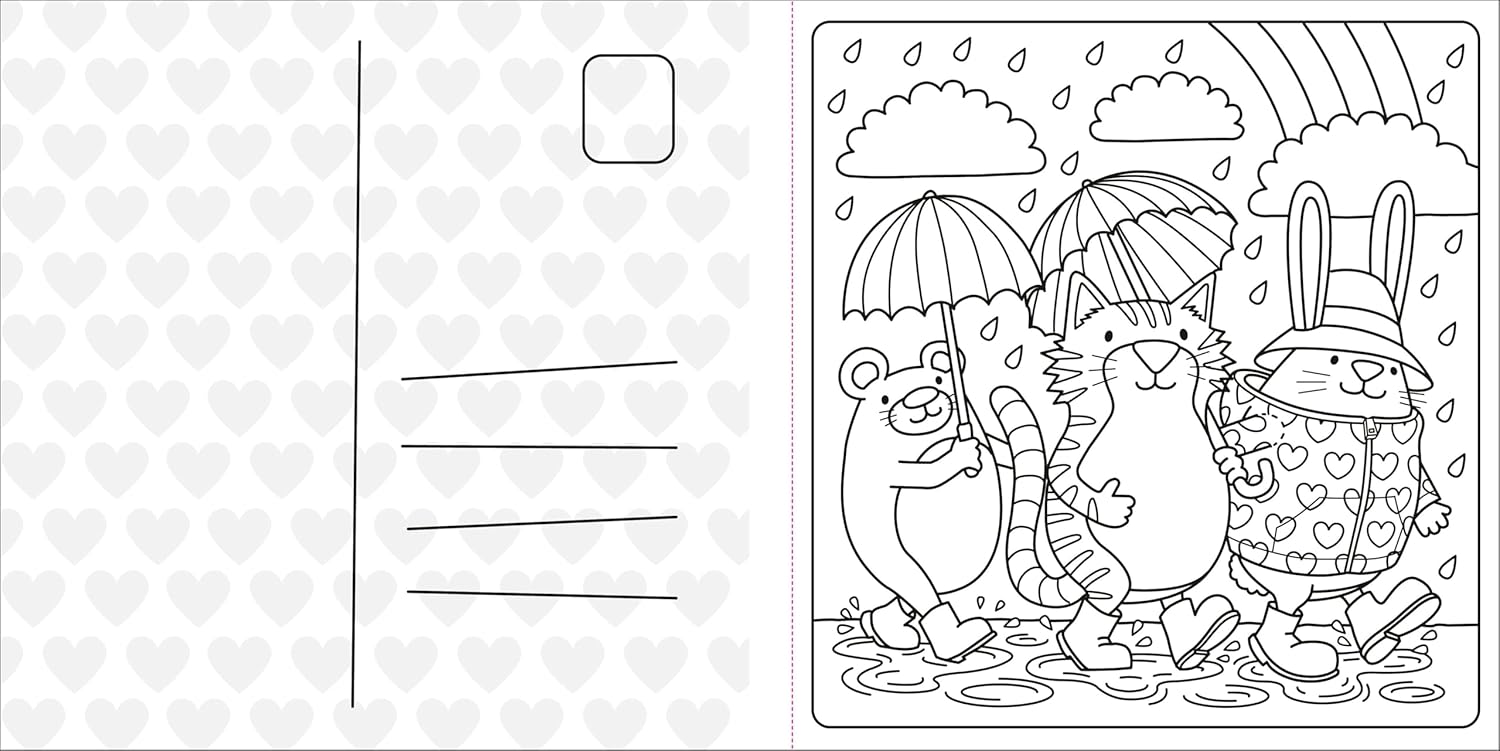 De-stress with adorable characters splashing in puddles, sharing cookies, exchanging sweet Valentine's Day cards and building hearts together with blocks. It’s time to enjoy the season of love through colouring!